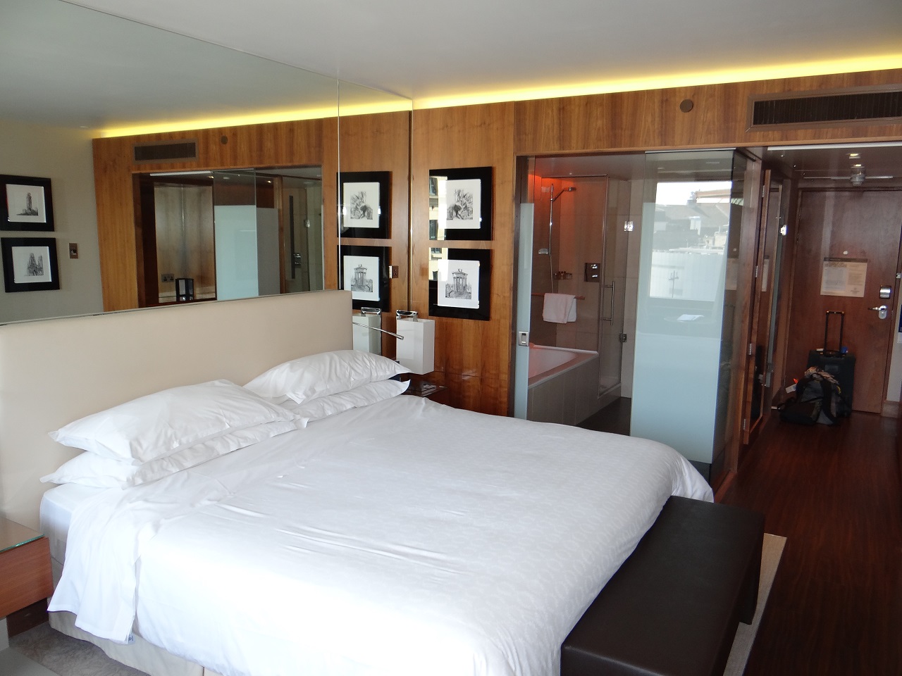 The King bed was a Sheraton Sleeper bed, which like the Westin’s Heavenly Bed, is a hotel bedding product that provides a wonderful sleep experience. The wall behind the bed was mirrored which helped make the room feel bigger. The room darkening drapes did allow some light in the room (not much) from above where they were not flush to the wall. Next to the bed, each side had room controls, a side table and light.