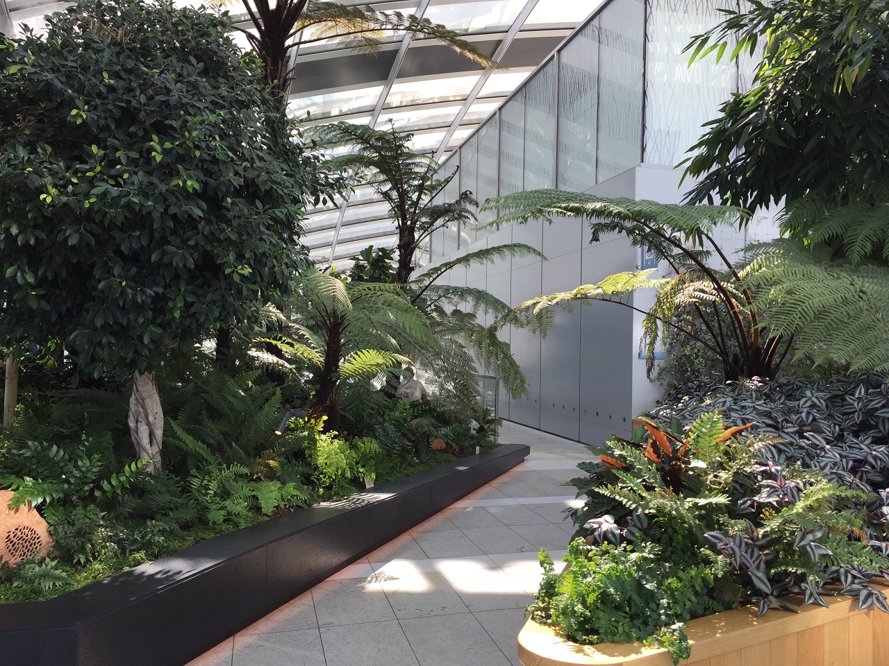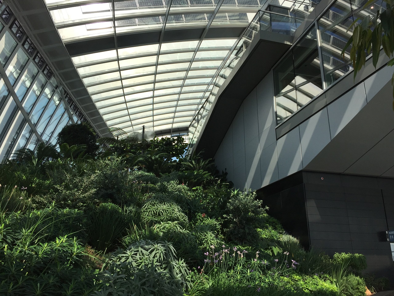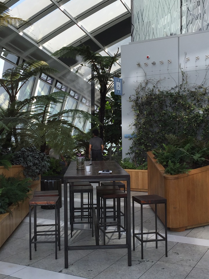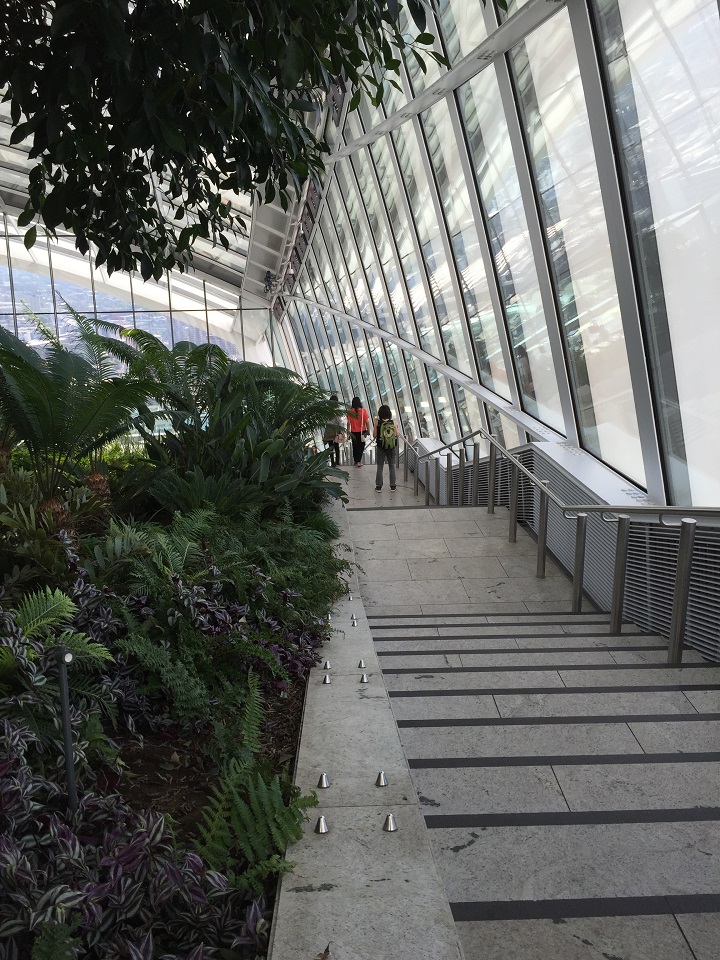 The greenery is located up and around the top floor in a U shape. There are stairs up and around providing you a 360 degree view of London along the windows. You need to be able to climb stairs for this part of the visit. On the interior of each staircase there are benches to sit among the plants.
