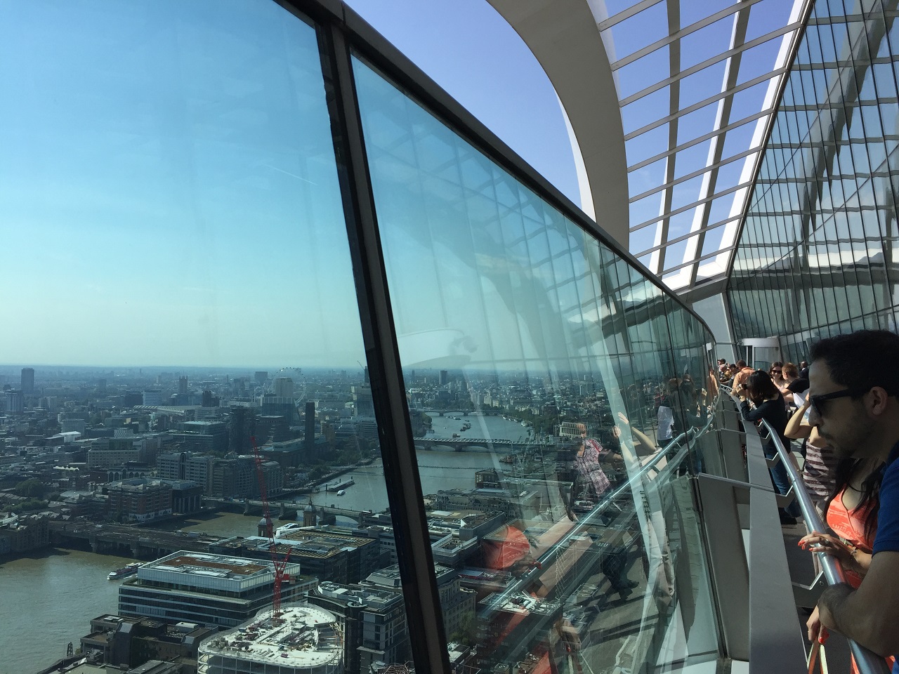 When you exit the elevators and make a right you enter the vast terminal in the sky – it feels almost like T5 at Heathrow but despite the airport security you just endured in the lobby, there is no gate to run to and the food options are much tastier. If you walk straight through the doors, you are outside with a glass paneled view of the Thames and London below. While I was enjoying the views, there was a guy not content to take a photo through glass that put his camera above the glass for an unobstructed photo and was quickly reprimanded by security due to safety issues (what if he dropped his camera over?). The sunny day and warm temps made the outside visit quite nice.