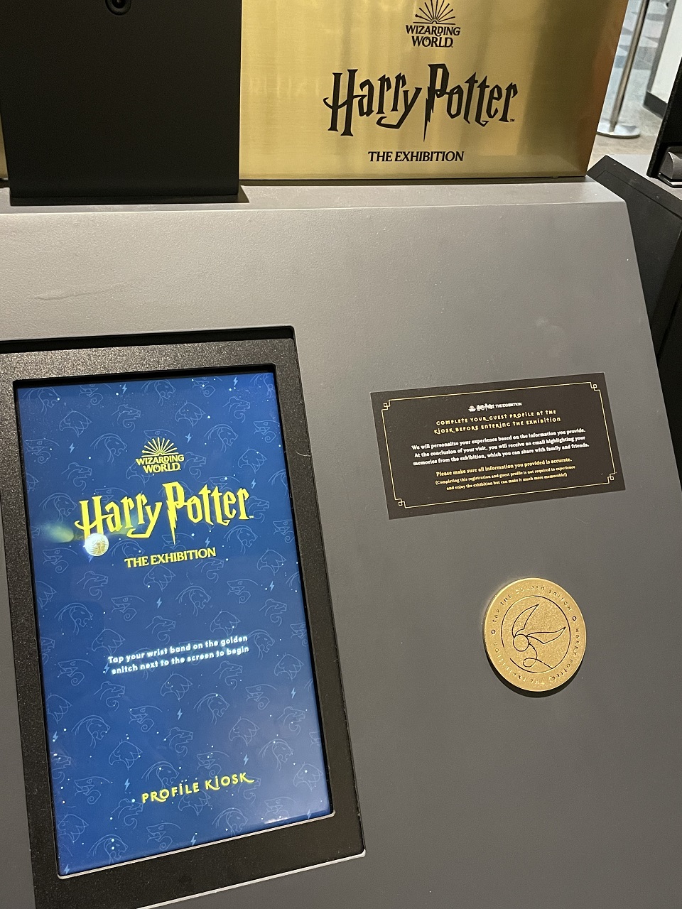 Once the data is entered into the kiosk, you will then need your photo taken (if you are tall like me, you’ll need to bend down to get to the camera level). Once the administrative work is done, you will tap your wristband square against the snitch keypad. Throughout the exhibit you will see interactive displays that require you to tap your wristband to activate. So make sure it works at the onset. (note: the radio frequency wristbands may interfere with other technology you are traveling with so be aware. I had problems with my iPhone so hopefully they have worked that out).