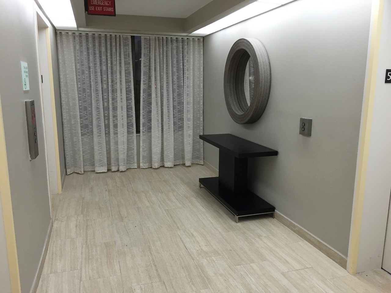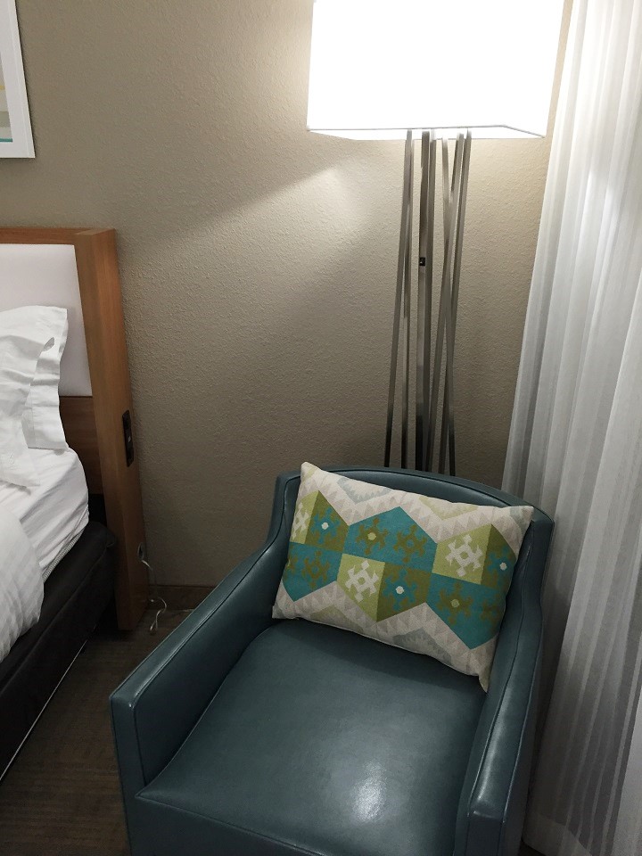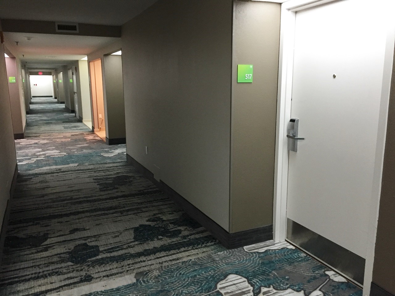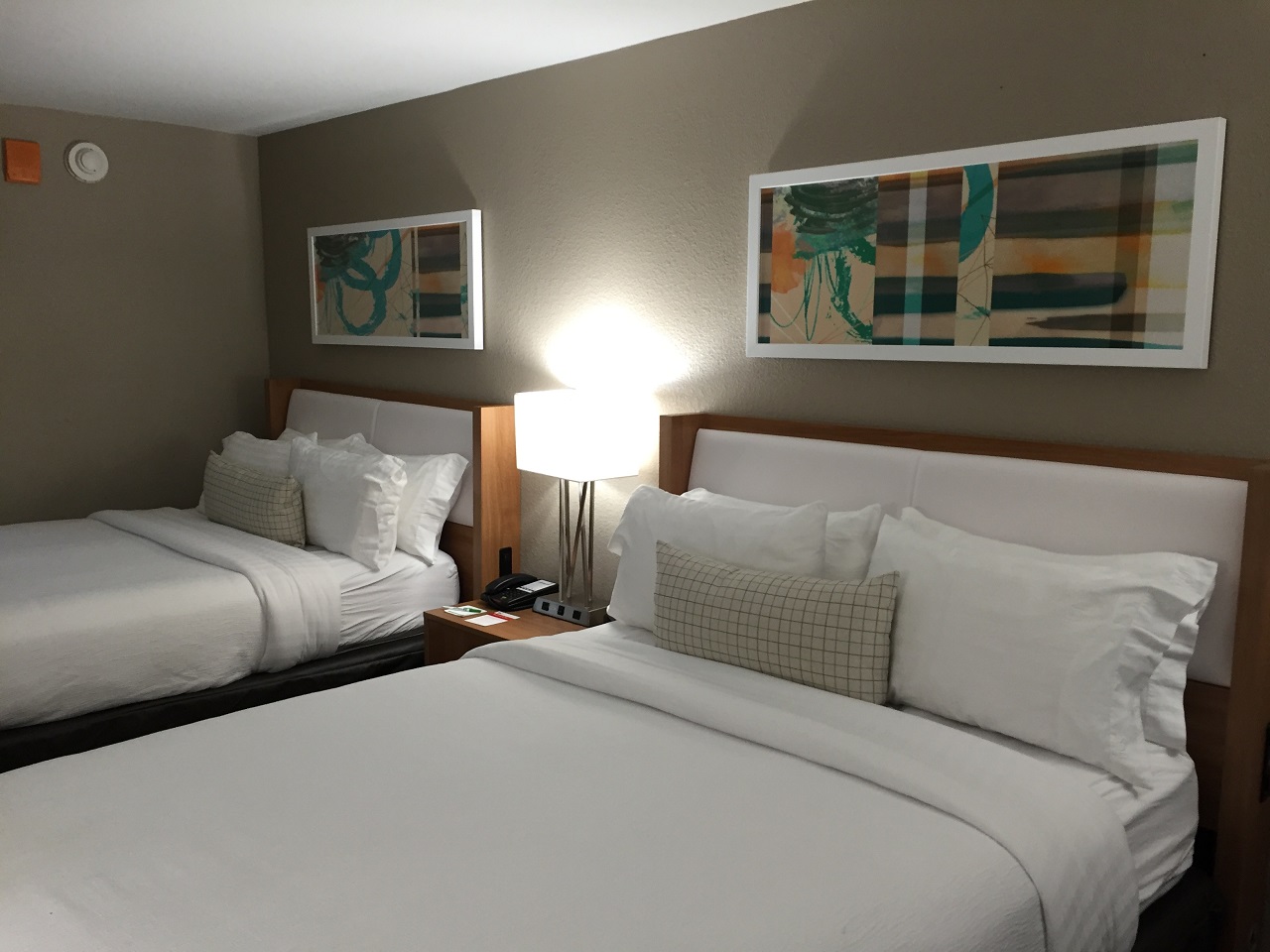 The elevators are still being updated as I noticed the prior incarnation paperwork (a former Howard Johnson hotel) inside. The buttons should (but don’t) light up when pressed. When we exited on the 5th floor, it still had that new paint smell (literally, we smelled paint in the hallway). We were greeted with updated décor as the lobby sign had shown. Suddenly, I felt better that his was a nice Holiday Inn before I even opened the door.