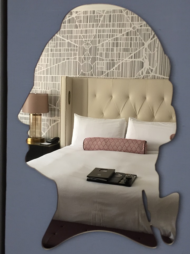 For a weekend of art, it seemed fitting to be staying at the newly renovated Fairmont D.C. in Georgetown. As you enter the lobby you are struck by the ceiling art and the mixed material designs plus that table! The bright and airy lobby space led to a sunken lobby bar and out to the patio space that would host a jazz trio on Sunday night. Art, Music and Luxury all before I’ve seen the rooms! It was a great start to the weekend.