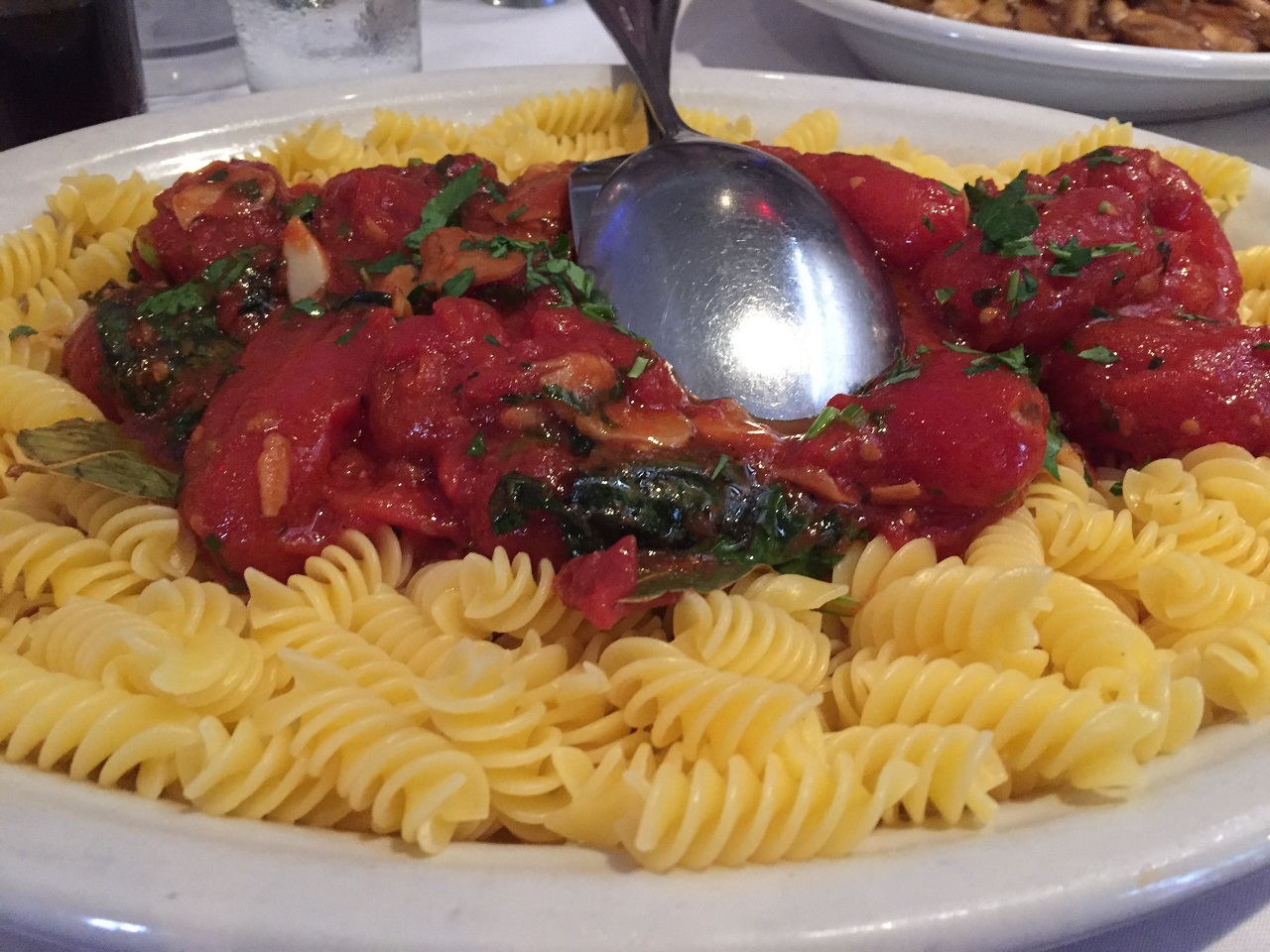 As I’m now 90% gluten and dairy free (I keep hitting a pizza or cupcake wall), I wouldn’t think to go for pasta but was happy to see Carmine’s NYC offered a gluten-free menu (as well as garlic free, dairy free, vegan and vegetarian menus). I chose a simple gluten-free pasta Pomodoro and they brought a family sharing portion which I hated to waste but seriously it was massive. The group had a tomato/mozzarella appetizer, a bread basket, Caesar salad, pasta dish and chicken Marsala served family style.
