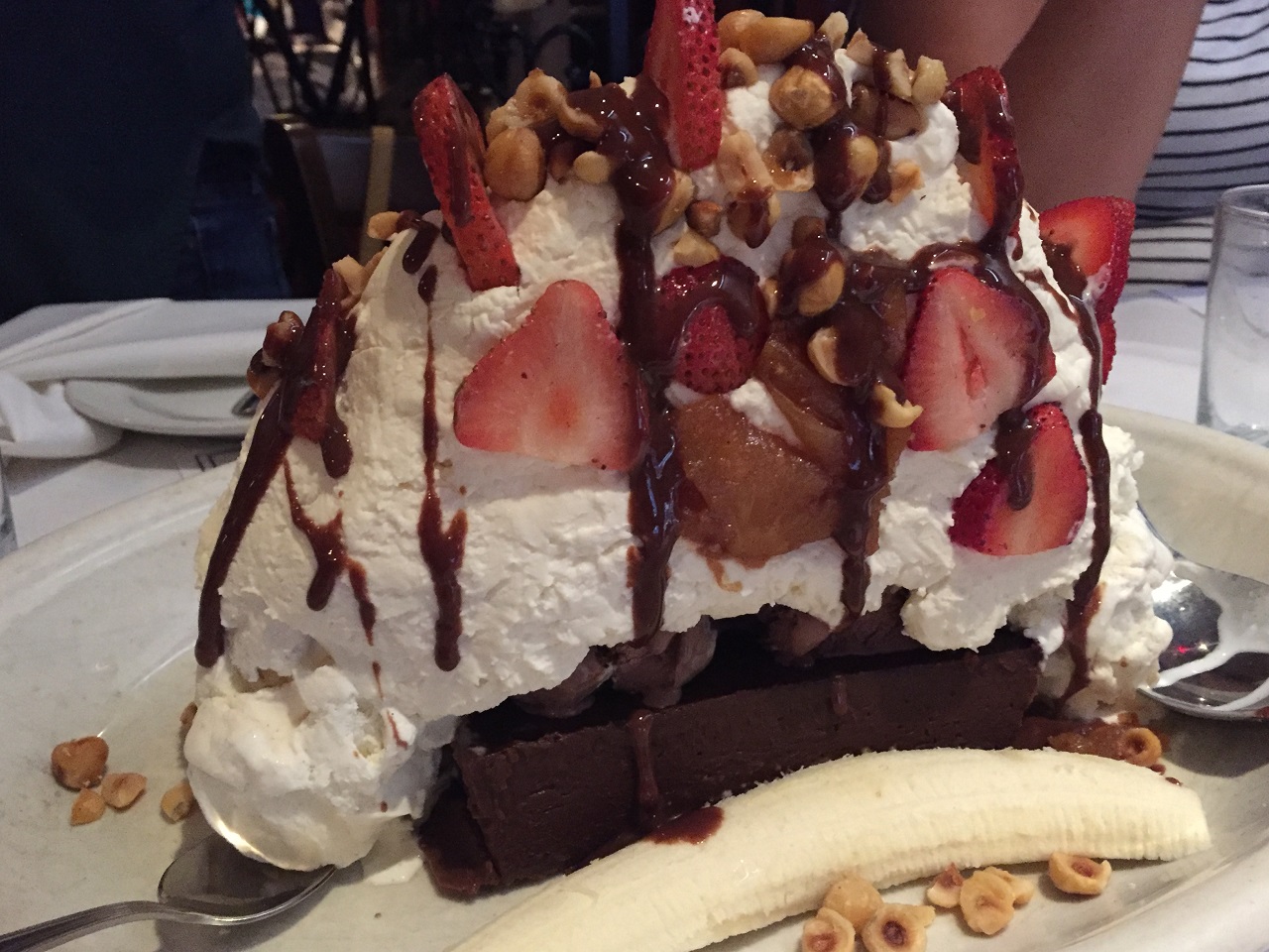 The famous dessert “the Titanic” consisted of a gluten-free chocolate torte (I could eat that), with a plethora of vanilla and chocolate ice cream scoops plus whipped crème. Finishing touches were the banana on either side of the torte with strawberries, chocolate sauce and cookie straws. In a word – WOW!