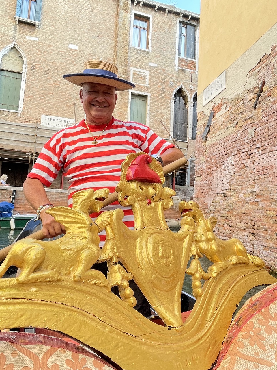 6:15 pm – Time for the Gondola Ride. I was in search of a gondola ride in Venice before the price change at 7pm. The price is fixed during the day at 80 euros per boat for a thirty-minute ride. After 7pm, the price rises to 100 euros. Mapping out a few options on the way to dinner, I found a small gondola station of two gondoliers, and we boarded at 6:30 pm which was perfect to explore the smaller, quiet canals before venturing into the Grand Canal chaos on the way back to the gondola station.