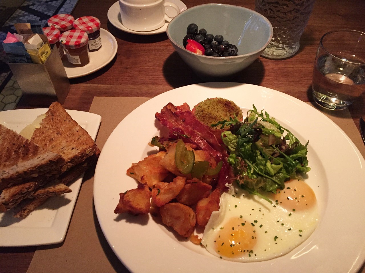 The next day, Friday, I revisited The Vine for an early breakfast and while the buffet was tempting (yikes $26!), I opted for an ala carte two eggs with potatoes and bacon for $20 (the toast was burnt which I told the server about but didn’t eat – having been a waitress in my former life I wouldn’t have served burnt toast). I mentioned the fruit on the bar and the waiter kindly brought me a bowl of berries to add a bit of healthy to my breakfast (no additional charge).