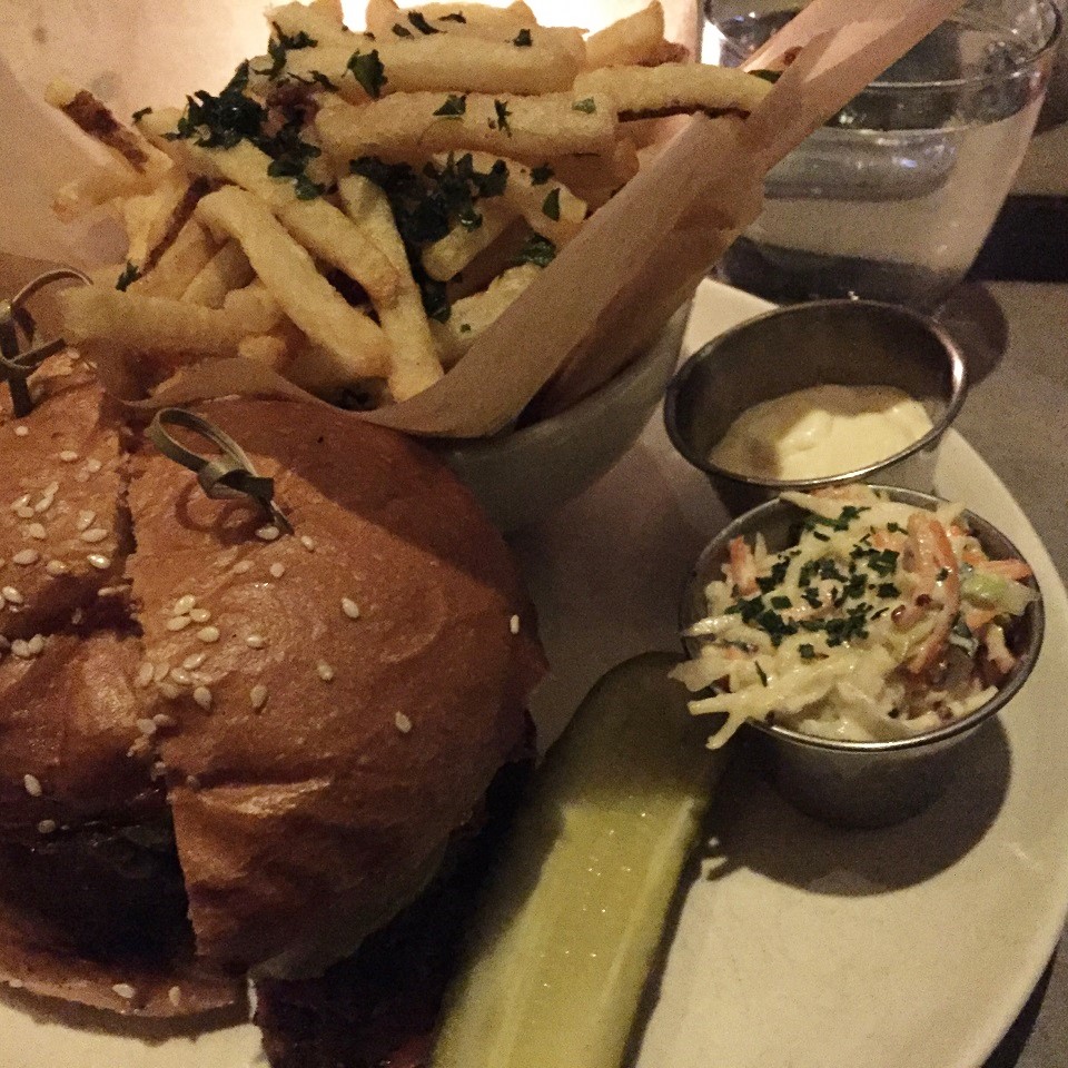 I didn’t make a reservation at L’Amico and arrived to find a wait of over an hour on a Thursday night so I ended up in The Vine bar area at a high top table. The service was quite attentive as I couldn’t get to the bottom of my water glass throughout the meal. They gave me a water bottle but kept filling my glass from it. The cookies gave me license to cheat on this trip so I ordered a burger. During my meal I had a group of twelve 20 somethings across from me meeting for the first time at the communal table and a loud guy behind me talking non-stop to his date (I wanted to send her a drink to say “sorry”) because he was a nightmare from what I heard him boast about the whole time. She said maybe five words. I was happily indulging my stomach and enjoying the eavesdropping and people watching at the restaurant.