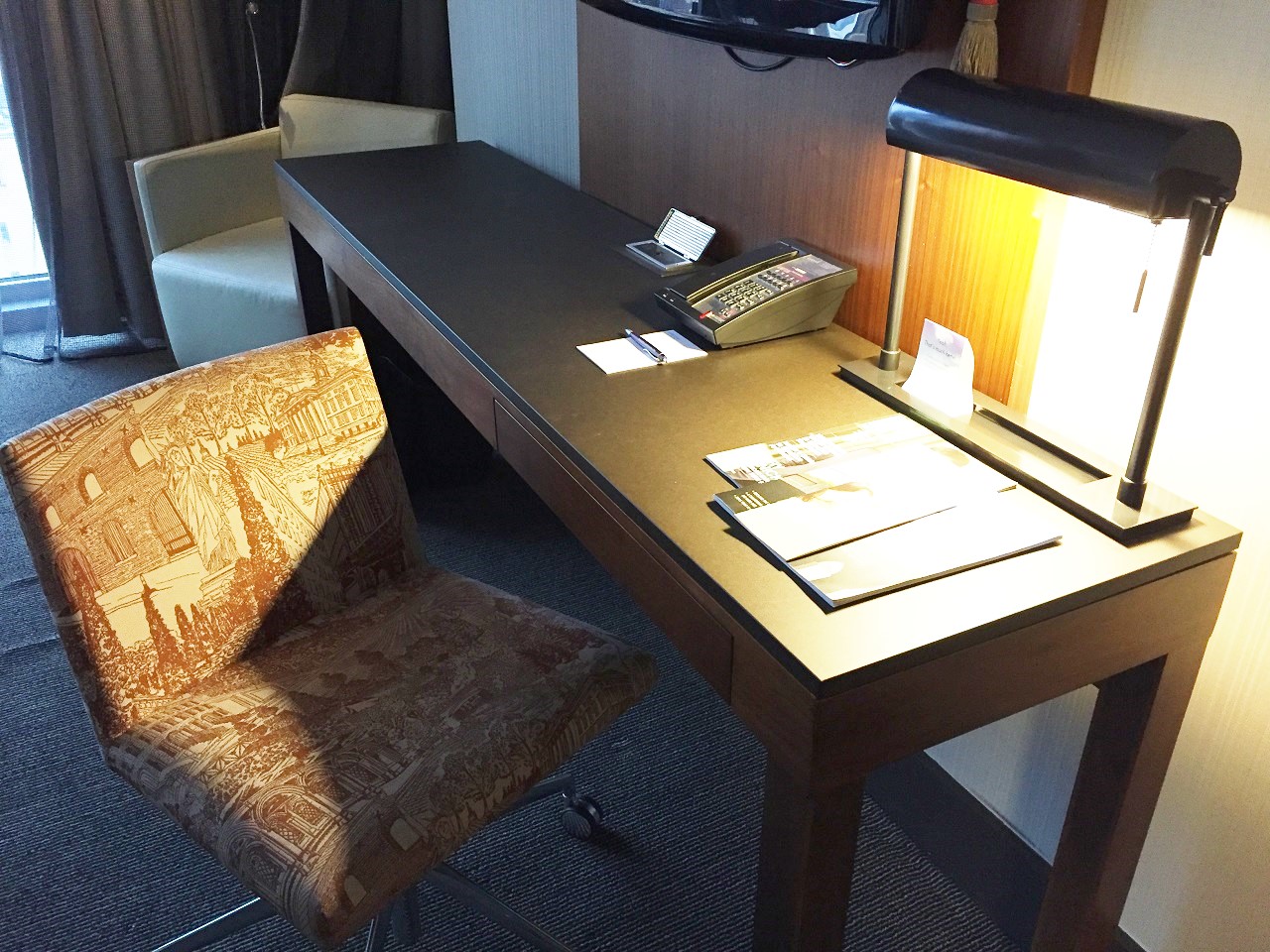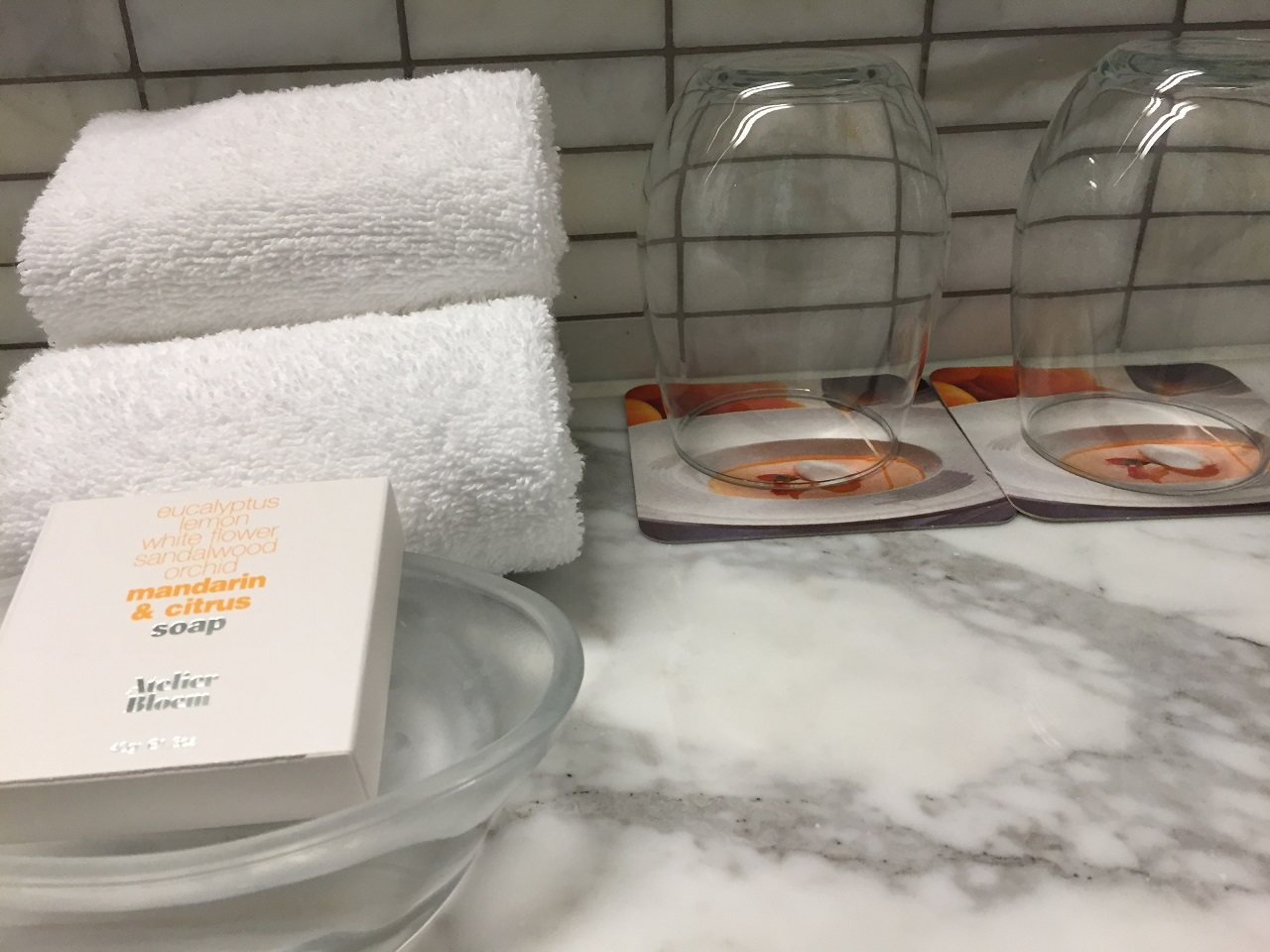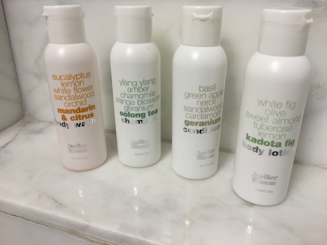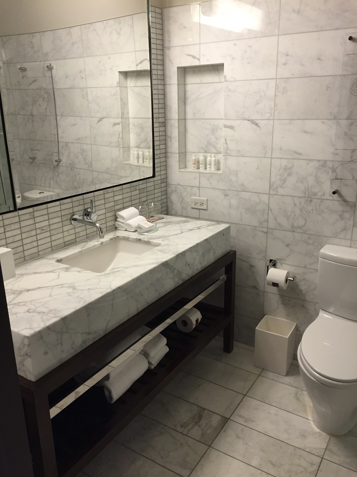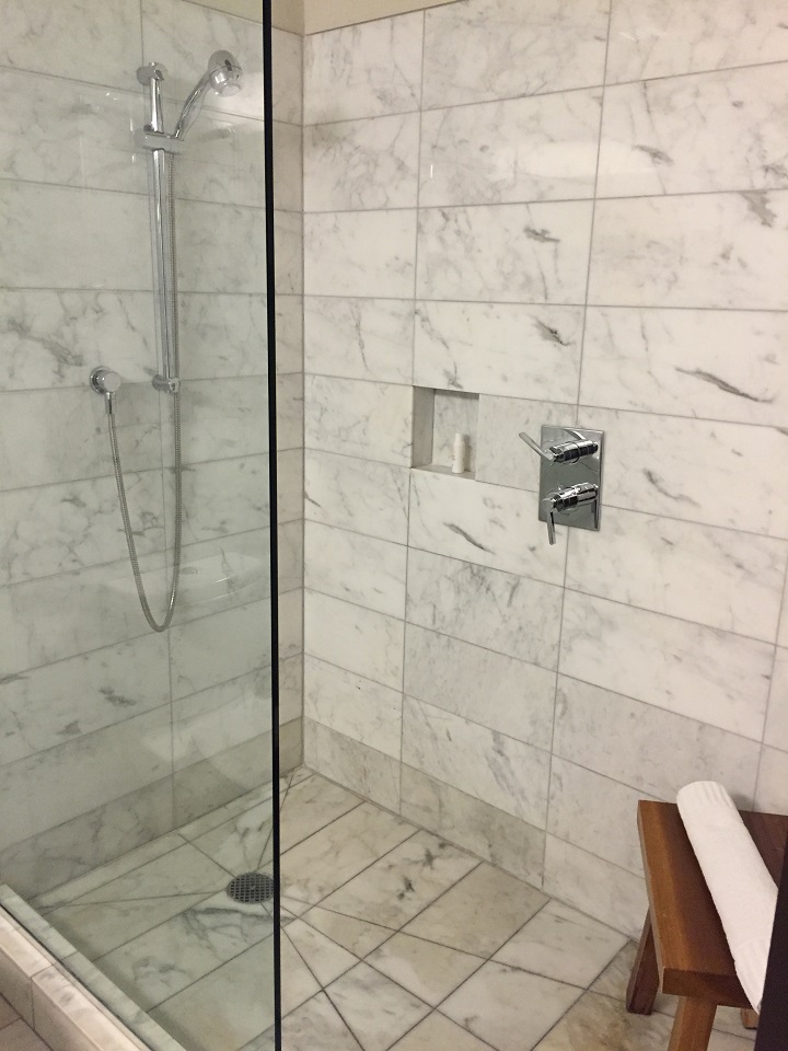 The bathroom had Atelier Bloem toiletries which I like but am amazed at the combination of smells that seem to complement each other when used. The marble bathroom was neatly arranged with towels, toiletries and an easy to find hairdryer on the shelf under the sink. The walk in shower had great water pressure.