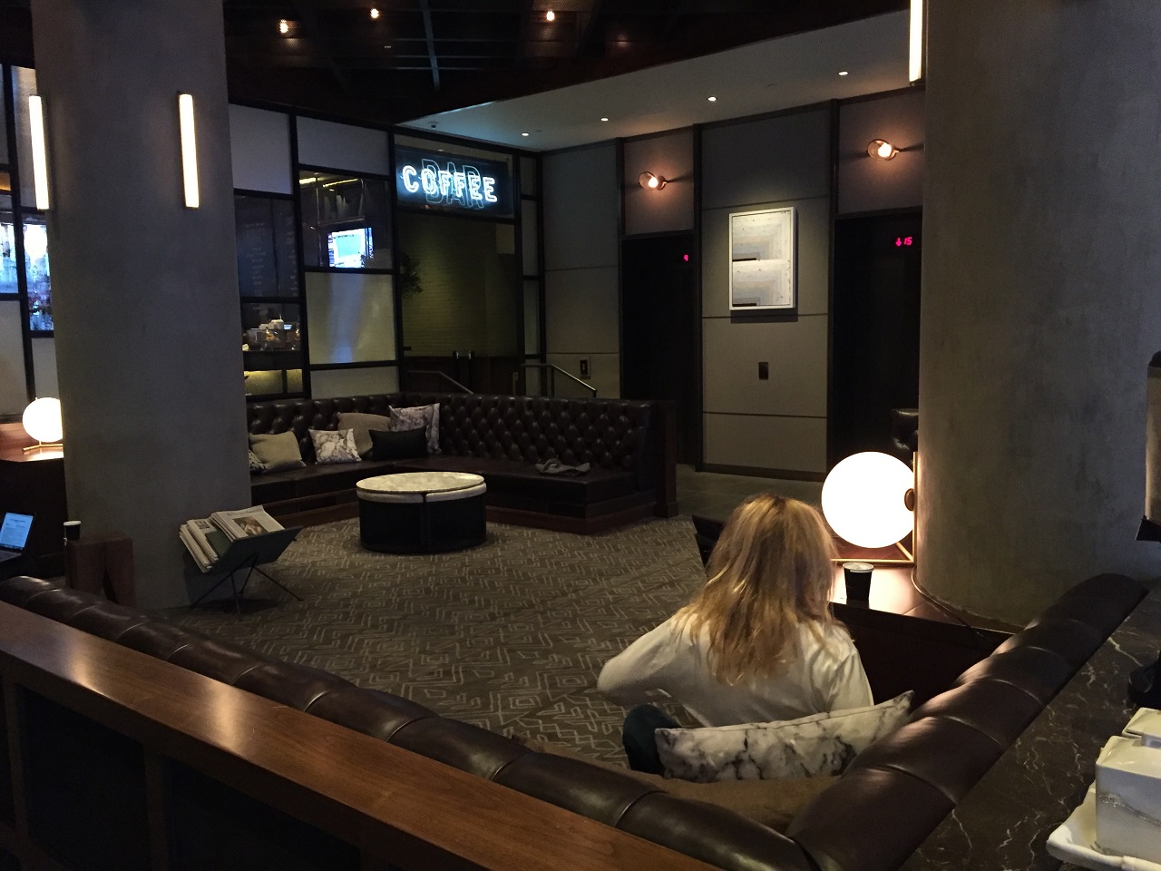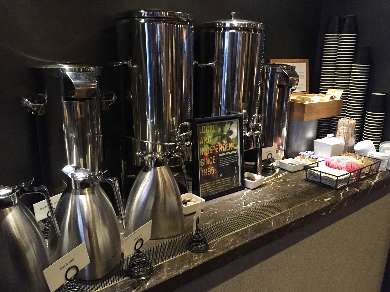 The lobby has a complimentary drinks area which has coffee/tea in the morning and water/juice during the day. There is a large leather couch area that was consistently in use in front of the lobby restaurant, The Vine. People were meeting, talking, and working all day and night. Having people in the lobby gives the hotel a definite lived in feeling of community.