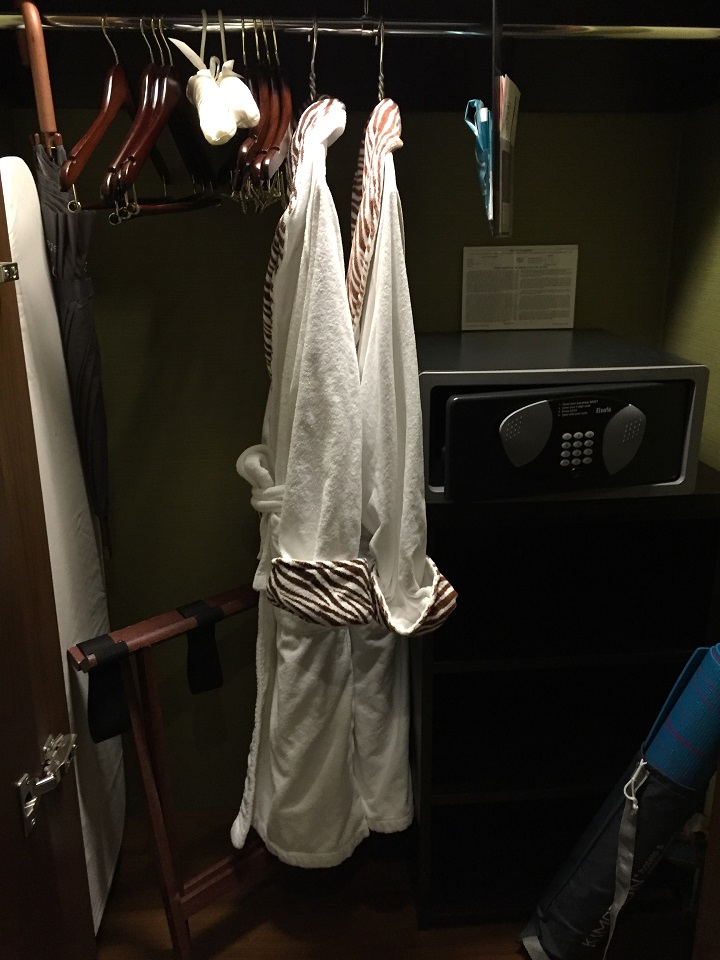 The wardrobe had the requisite Kimpton robes in animal prints. It also had the Kimpton in room yoga mat, umbrella, iron/ironing table and in room safe.