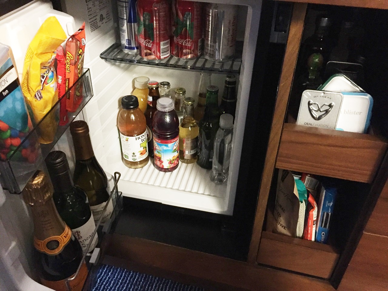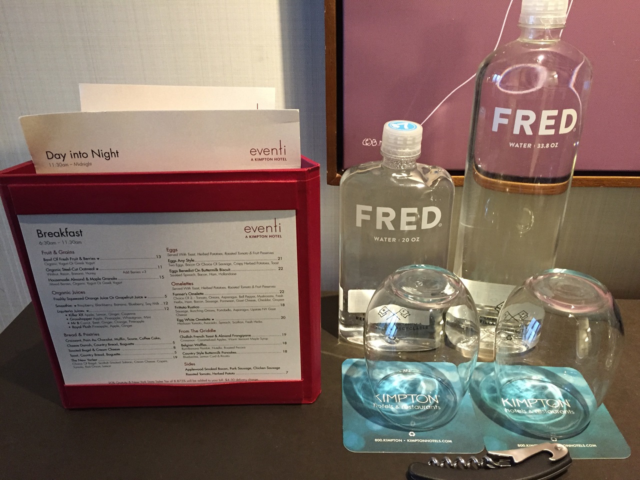 There was a stopping point table across from the bathroom that I was able to drop my stuff before reaching the desk in the bedroom. This area had the minibar snacks and my Fred water as well as drawers for storage. Kimpton Karma members get a $15 minibar credit in NYC ($10 in other cities) so I like to see what my options are knowing that I’m just going to spend it on Fred water.