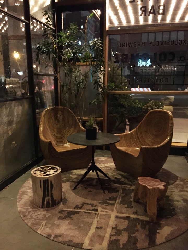 A ten minute walk (depending on construction and how heavy your bags are) from NY Penn Station, the hotel entrance is at 851 Avenue of the Americas (between 29th & 30th Streets on 6th aka Avenue of the Americas). I walked past two of my favorite restaurants in the area – Pennsylvania 6 and Friedman’s Lunch next door on the way to the hotel. Don’t walk too fast though as you might walk by the front door as it blends so nicely with the restaurant décor. But once you enter, you are transported to a swanky Kimpton with the dark woods, cool leather seating areas, hip music and what appears to be even cooler people. Don’t fret though everyone seemed to be cool – young and old. I felt at home in the boutique property lobby.
