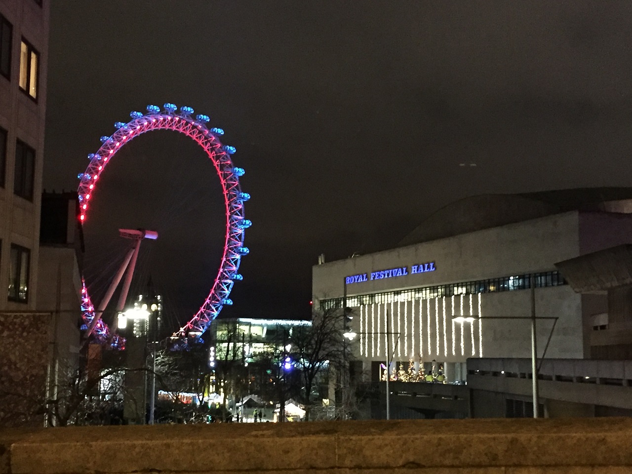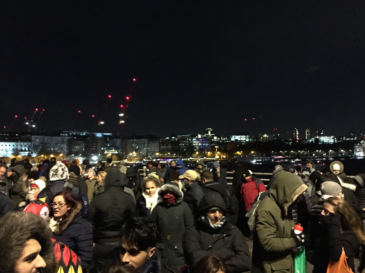 Waterloo Bridge is a motor roadway with a small center divider. The sides of the bridge have pedestrian walkways but those were closed to ticketholders and allocated to event security. The bridge contained a plethora of portable loos and nary a line. My map also said there was food and drink for sale but I never got that far over the bridge. My initial spot on the bridge, I was standing with many people huddled on the ground to keep warm. One guy was swaying back and forth and with two hours until midnight he was clearly drunk already so security easily removed him. I decided to venture to the loos (thankfully I had a US flashlight (UK torch) with me as they don’t have light inside) and then on the way back found a small slice of the curb to sit on for the next hour and a half. No one spoke to me but I had a great people watching spot for the night. It was a nicely mixed crowd – young, old, families, groups of friends and a few solos like me – overall a happy crowd.