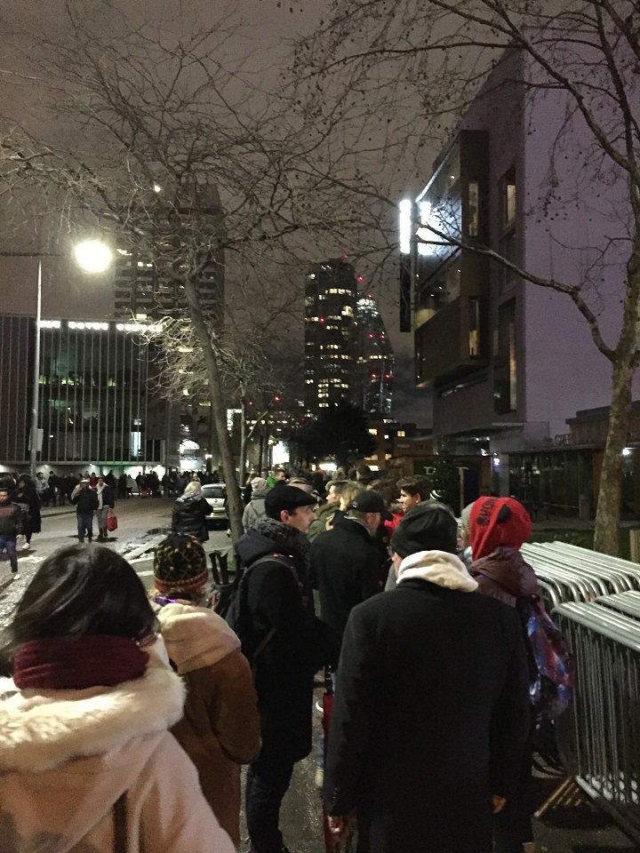 The line for security was quite long as it wrapped around the block directly below the bridge. There were two lines in the area so make sure you are in the right one. Luckily the rain had stopped and while the streets had a few puddles, the night sky was clearing. It was cold but not so bad. Since this is London, you are allowed to bring alcohol in with you but nothing in glass bottles. The guy in front of me left the line and ran into the corner store to buy some beer. You are also allowed to bring blankets, food and friends (with tickets of course).