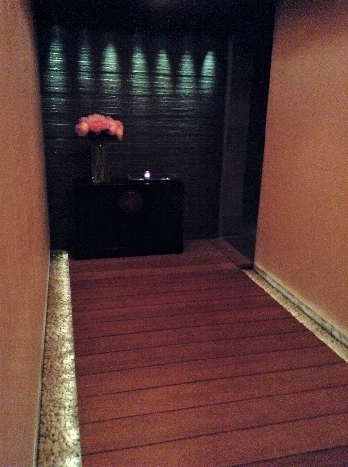 The spa is located on the basement floor (lower ground level) in the corner with only the orchids to indicate it’s presence. Opening the door, I was quickly enveloped in a spa like zen zone (spa music is key). Welcomed by the front desk attendant, I entered the ladies side of the spa zone with wooden floors, corner chairs/candles and bamboo.