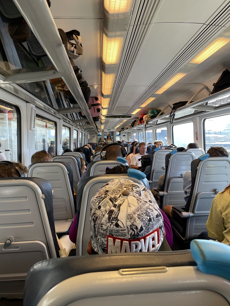 I found a seat near the exit door and put my luggage initially on the adjacent seat (wishful thinking) then under my feet (barely fitting) and my backpack above. One couple had four large suitcases and the husband was left to stand and attend to them in the area between cars. Everyone was chatting about the absurdity of it all and eventually the train pulled away a few minutes late. The conductor walked about at first before we hit the more commuter part of the stations/stops when the aisles would fill with passengers standing between stops. The people ebbed and flowed until it seemed only cruise passengers were left. At one point, the disruption in the rail lines by Southampton became more evident online and folks were worried. The conductor said “when the cars split, this won’t be car 1 to Southampton as you were told, it’s going to be Car 1 to x destination”. I mentally prepared how to exit at the train station and whether or not there would be space in the other cars to Southampton. While I was calculating all options and potential options at the train station, the conductor returned to announce “the train will just end in x town”.