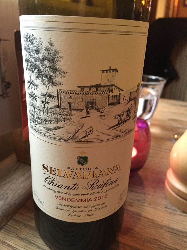 The menu had a good selection of starters, entrees, sandwiches and salads plus the roast menu. We ordered a nice bottle of Chianti, two starters and our roast dinners – grass fed beef for me and lamb for my friend with a side order of sweet potato fries just because I was in the mood for them. The wine quickly arrived followed by our starters – calamari for him and asparagus in goat cheese for me.