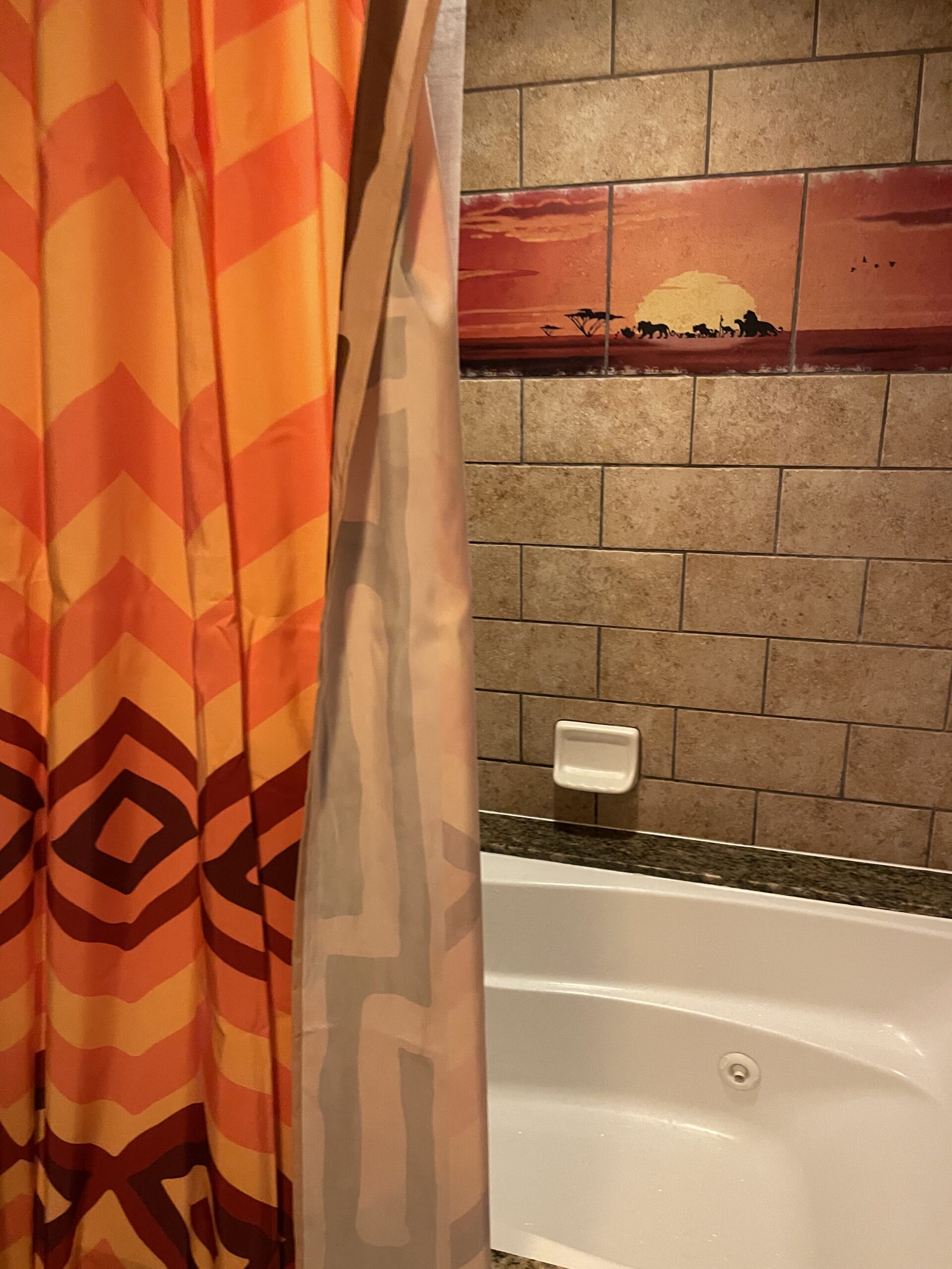 The bathroom was dark woods and burnt orange. It had two sinks, a large sunken bath tub with shower and a separate toilet room. Of the entire room, this was a disappointing space. I’m not sure if it was meant to have nicks in the wooden furniture that were not covered up or if part of the décor. The toilet was low to the ground and lacked pictures or art of any kind making it a room that the decorator forgot about. The toilet paper was barely one ply which seems like a small detail but for a deluxe hotel I expected more to be honest. The Disney toiletries were large bottles on the wall for environmental purposes with only the bars of soap being separate.