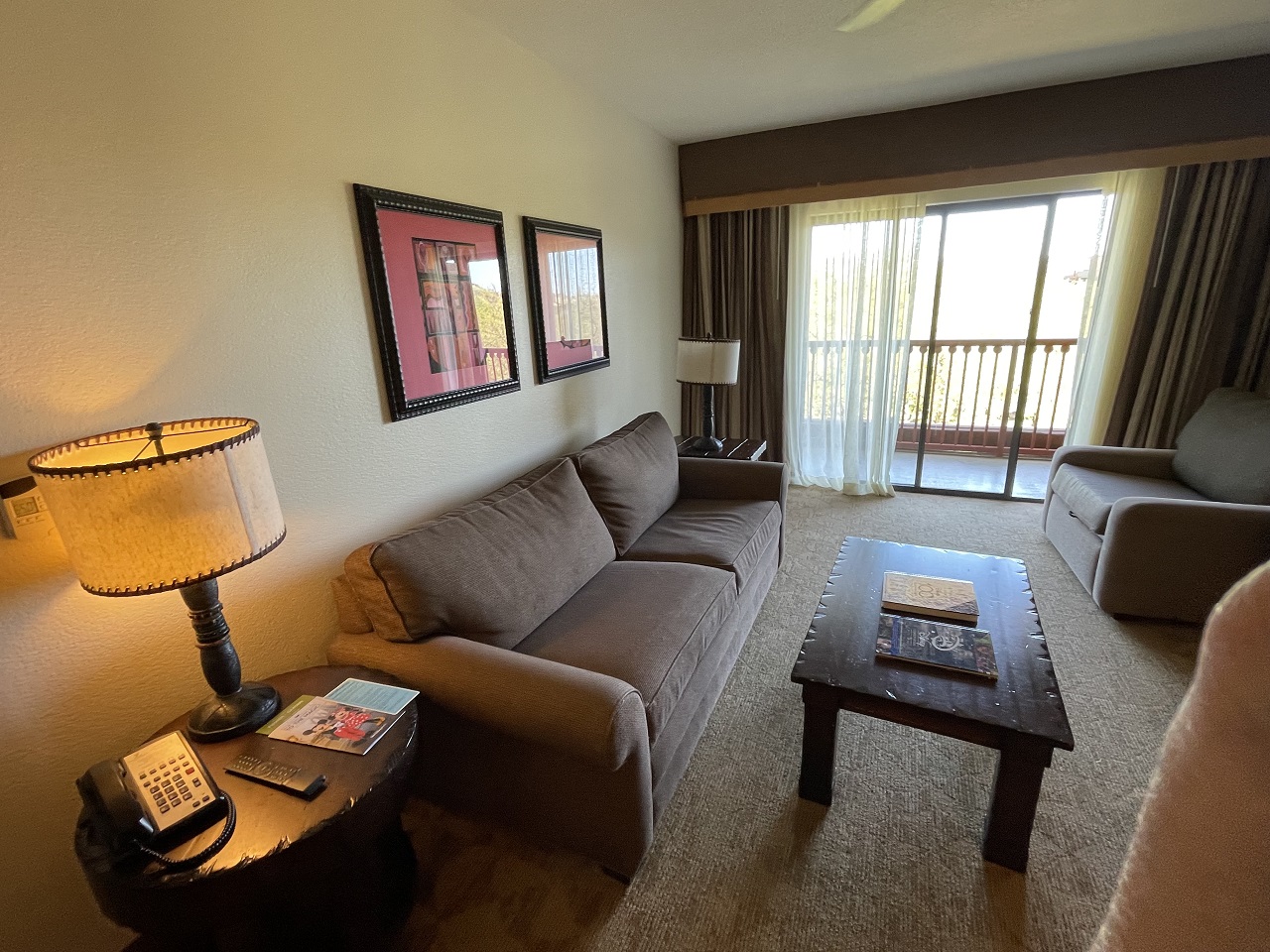As I walked into the room (villa), the kitchen was on my left and on my right was a connecting door as this villa can combine with the room next door to accommodate more guests. I had a bench table that fit four people and a sofa, chair and television in the main room with balcony in the distance. The kitchen was stocked will all basic needs – dishes, silverware, glasses, pots/pans, etc. The gift shop in the lobby sells food supplies but you can also order items in advance to be shipped (or delivered) to you at the hotel.