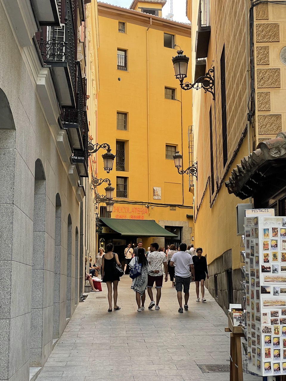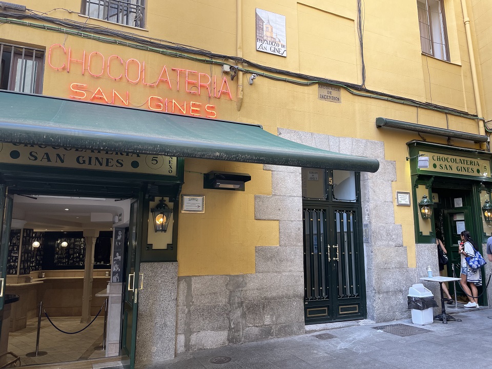 So, I did what any good tourist would do, I searched google and tripadvisor and then followed the tourists down the passageway (alley) to a yellow and gold hued building with a red neon sign that in the sunlight was hard to see. I arrived at Chocolateria San Gines Madrid, which was founded in 1894 (yes, it’s that old) with no idea really what I was to do next. I walked the length of the building to see seats inside and outside in the courtyard where servers were delivering trays of churros with cups of chocolate.