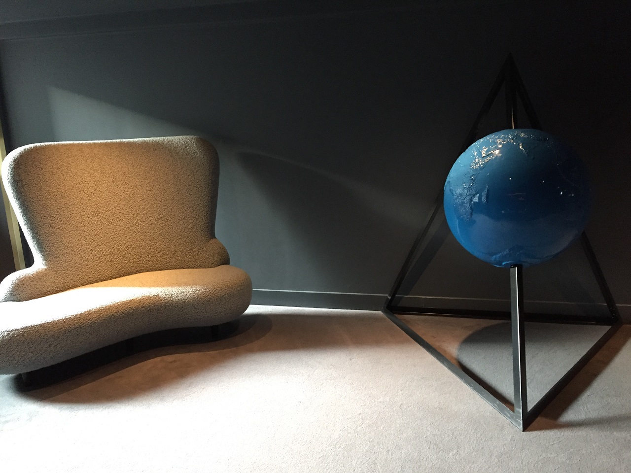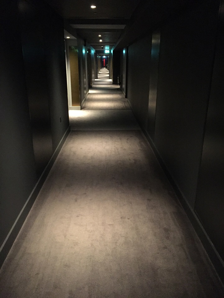 The elevators are security accessed by room key card. During the busy New Year’s Eve weekend, the hotel security was throughout the lobby ensuring a pleasant night for guests and visitors. While the elevators are filled with fun art pictures and music in the background, the guest floor hallway is grey and dark. A bit of a contrast similar to the elevator bank which was dark and led to a beige settee and blue globe artwork on the 4th floor before I walked around the building and down the hall to my room.