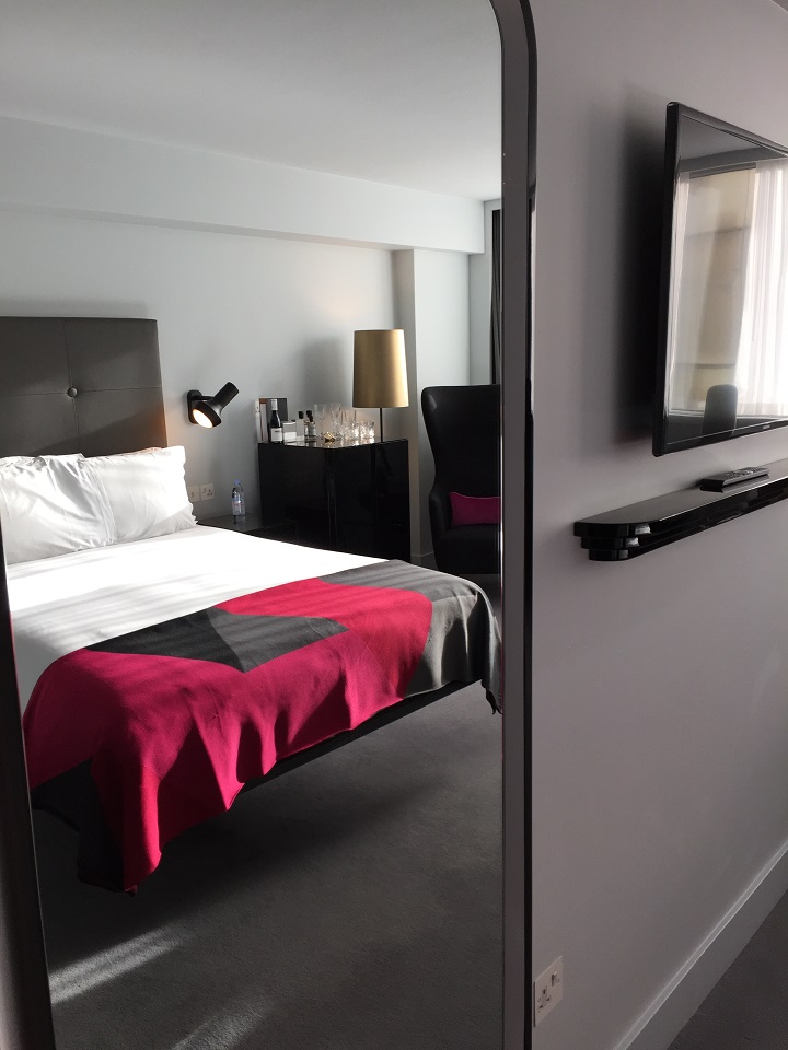 When I opened the door to the room, I walked into a rather large room (for London). The color scheme of grey, white with a few pops of color was soothing. I didn’t much like the color form art (showing my age) on the wall preferring a nod (or two) to the origins of the building, Sea Containers, and its maritime history or to the artist Mondrian whose art is full of color. It’s only because I’m on an art kick to give the guest some insight into the history of the property and/or city that I feel many hotels woefully ignore this detail in room and in the hallways.