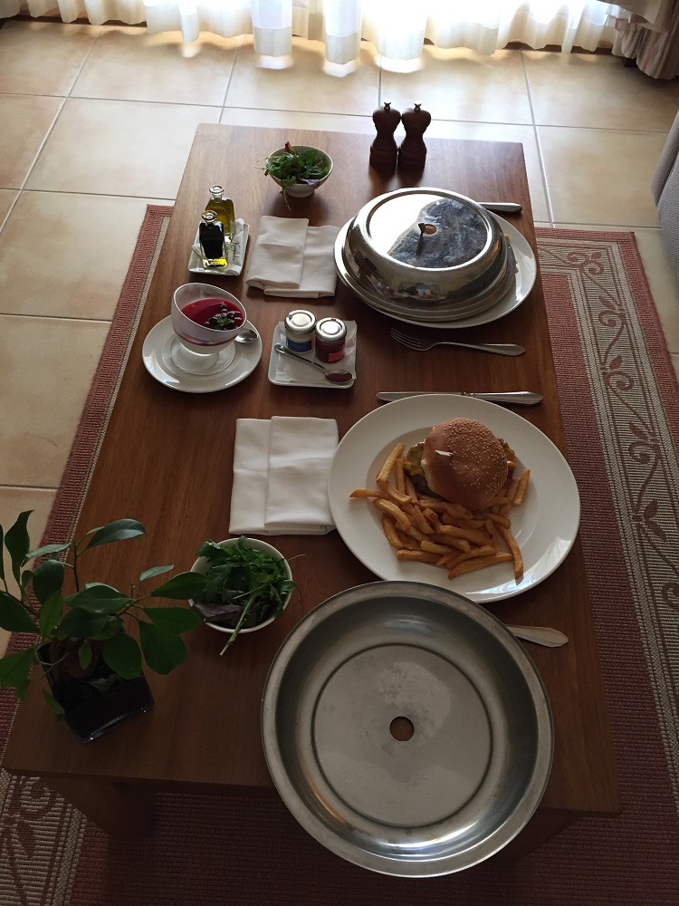 One of my favorite travel indulgences is hotel room service. Landing in a new city, arriving at the hotel and perusing their room service menu gives me a sense of the hotel, the food culture and a bit of sticker shock (burgers are quite expensive!) I anticipate the knock at the door to announce the arrival of my food. It’s exciting each time as the setup differs, the experience created varies and I still love when they remove the covers for each part of my order.