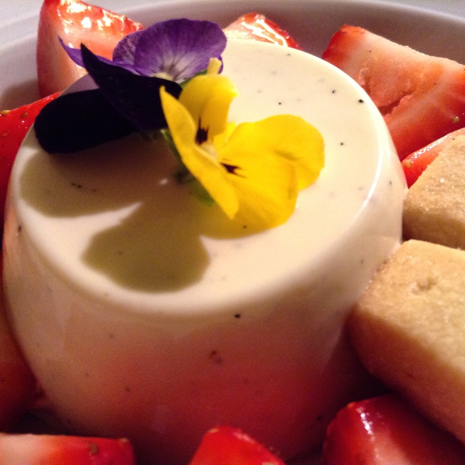 London Rosewood Hotel – dessert was divine! The panna cotta with fresh strawberries, shortbread biscuits (cookies) and fresh flowers.