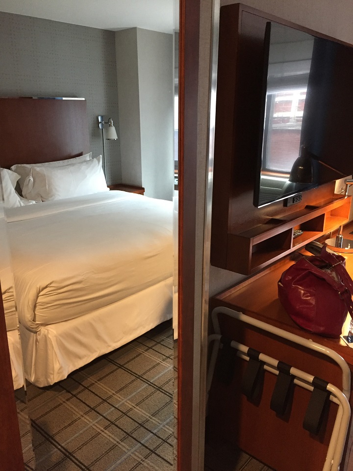 From Penn Station, I took a taxi to the hotel due to my luggage, otherwise, I would have easily walked. I arrived after the standard 3pm check-in so my room was thankfully ready. I was acknowledged as a loyalty Marriott member and thanked for my loyalty. The Times Square Four Points hotel features were explained to me (lobby bar, restaurant, coffee area, free Wi-Fi, etc.) before I waited for one of three elevators to whisk me up to the 19th floor. For a hotel with 244 smoke free rooms, I was surprised that the elevator wait was minimal in the lobby and on the guest room floor. When I arrived on the preferred floor, I found my room around the corner. This floor was small with only eight rooms. It was nice not having to walk down that long hallway to the room.