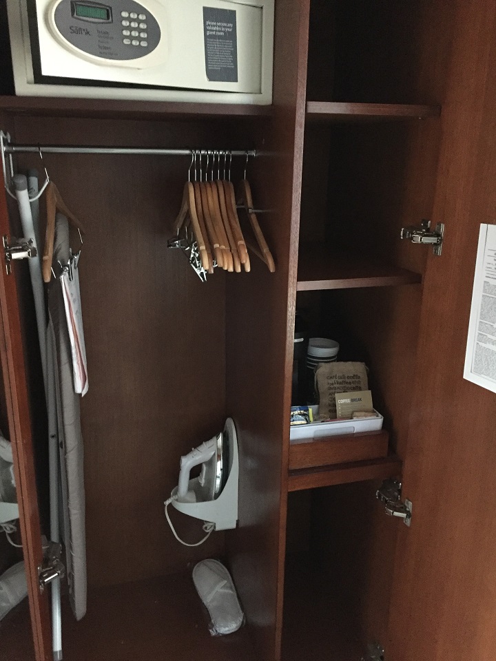 The bed, a Four Points signature bed, was a comfortable respite from my journey from Philadelphia so I crashed out for a few minutes before walking to the Broadway theatre for my ticket to “Dear Evan Hansen” later that evening. There is a storage cabinet that held an iron, ironing board, safe and to my surprise – SLIPPERS! Seriously folks, slippers have become my thing now – in many hotels only suites get slippers so I always ask for them because I will not walk in any hotel room in bare feet or in my socks (my OCD moments).