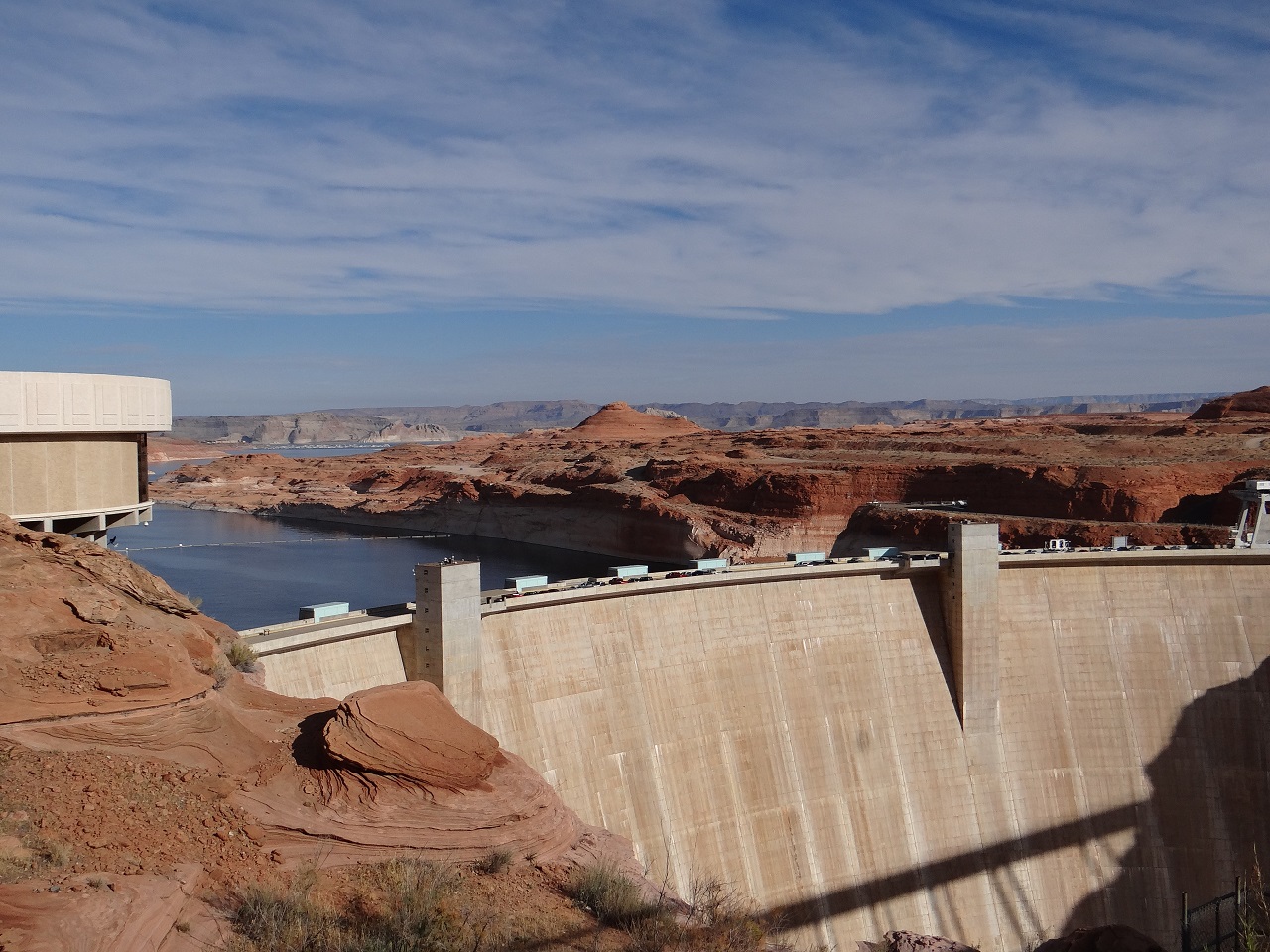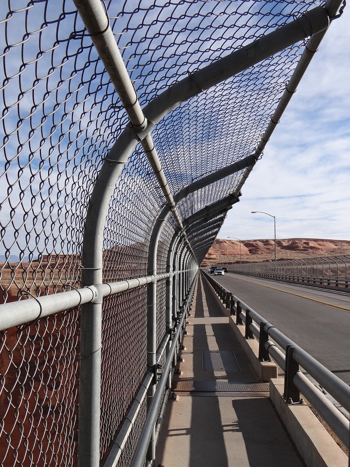 The drive to the Glen Canyon Dam was quick from Horseshoe Bend and again as it was a Wednesday in November, parking came easy in the vast lot which during peak season is packed with cars and tour buses. I walked into the visitor center to view the exhibit (free) and the expansive view of the dam below. There is a restroom and gift shop plus guided tours four times a day for a small fee with limited number of guests. The first tour of the day was at 10:30 so I wasn’t able to stay for that as I had a 10:30 a.m. tour at Antelope Canyon. After the exhibits inside, I walked across the empty dam bridge for photos (there are cutouts in the fencing for photos).