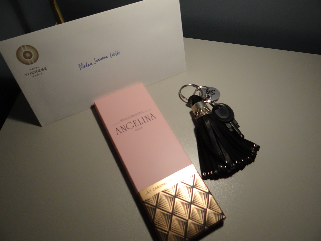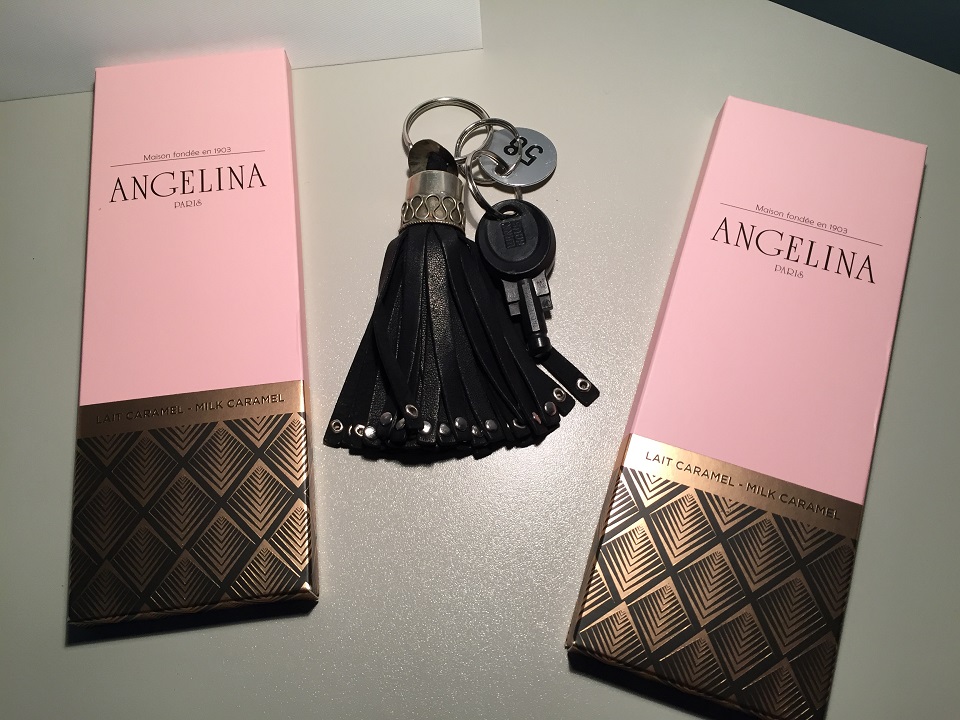 The desk contained a hand written welcome note, bottle of water and a bar of Angelina chocolate (the kind of welcome I like!) Mom doesn’t like chocolate so more for me!