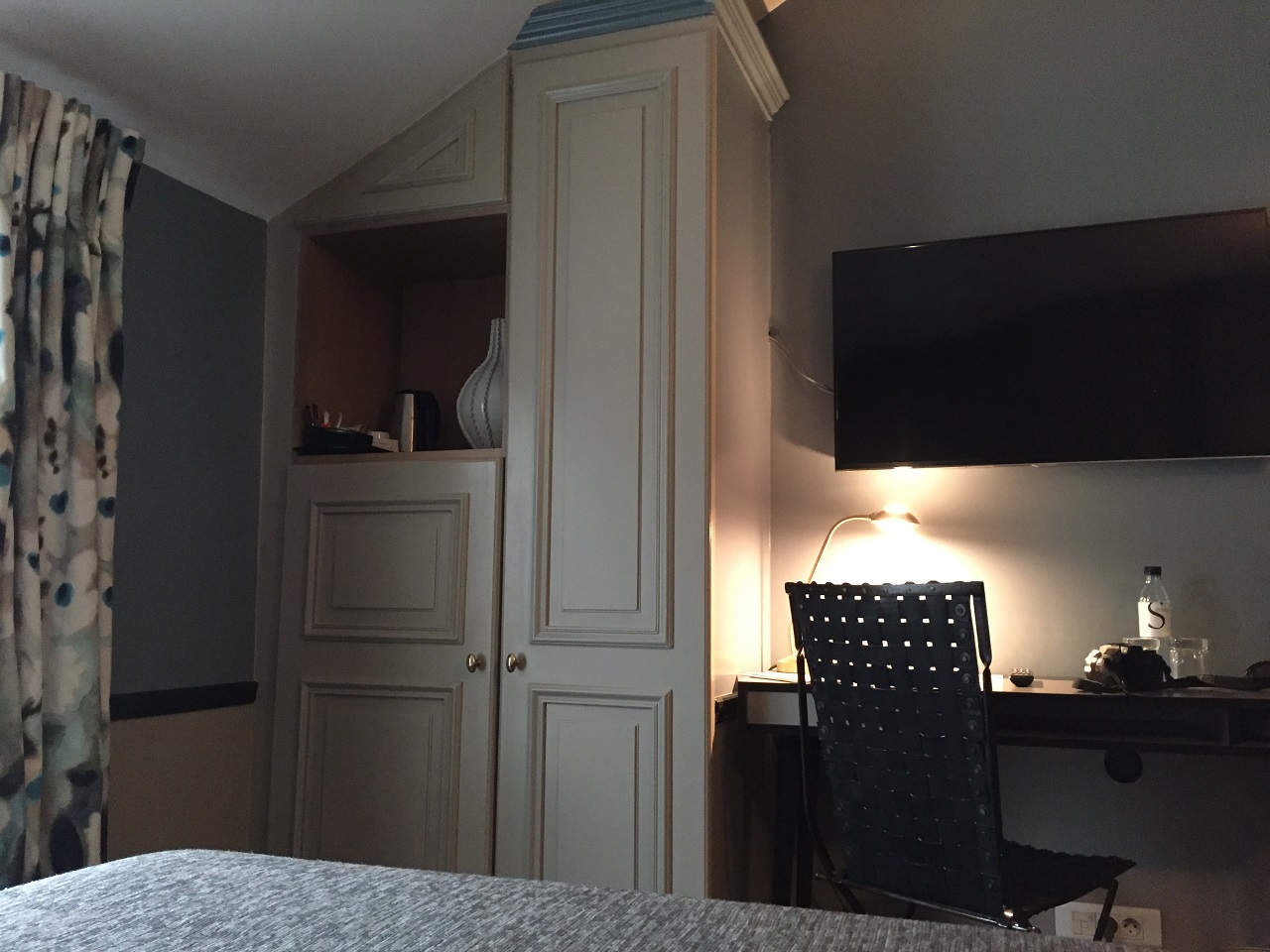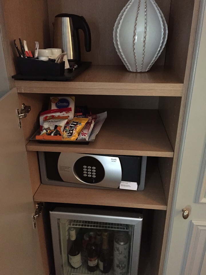My room was larger than Mom’s (I had two single beds pushed together in this double room). I had more space with an armoire filled with coffee maker, safe, minibar. The desk had room to work and the television above was a good size if I wanted to watch TV (I didn’t). The bed was firm but that didn’t prevent me from soundly sleeping. The wifi was included and required a password to use.