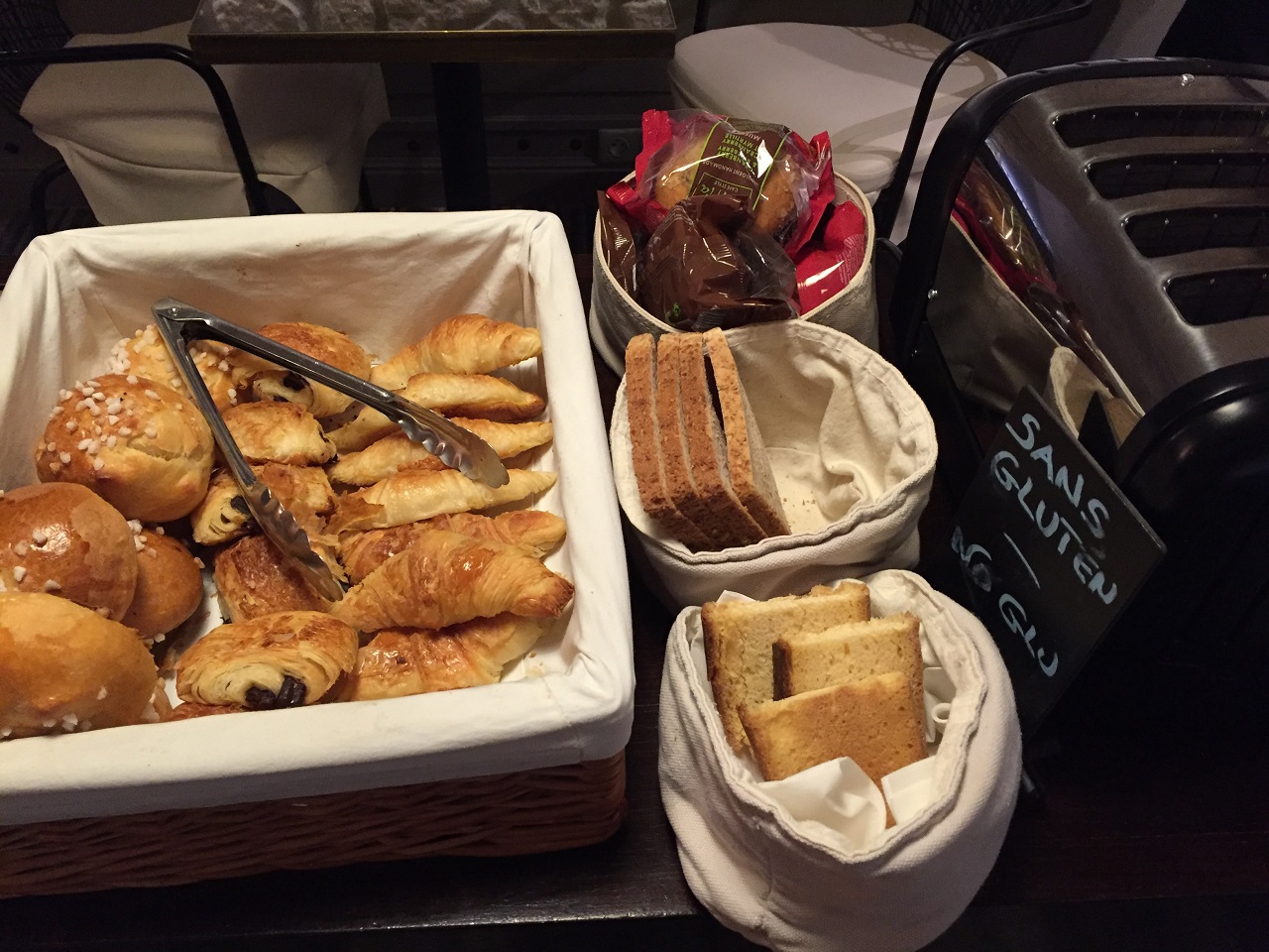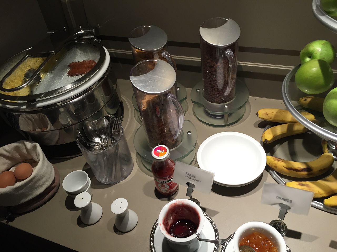 The breakfast choices are Full, Continental and Express costing €6-€15 per person. Of course, Mom’s cereal was part of the full breakfast so that was €15 each day. It was funny to see the face she made with the Yoplait yoghurt as it is so much different than the U.S. version. The breakfast included scrambled eggs, hard boiled eggs, cereal, fruit, cold cuts and a bread table, which included a basket of gluten free bread.