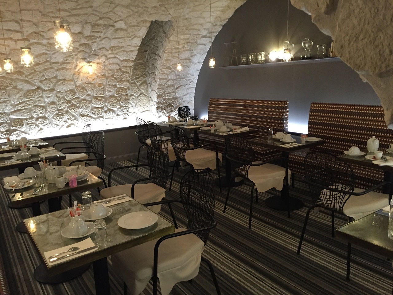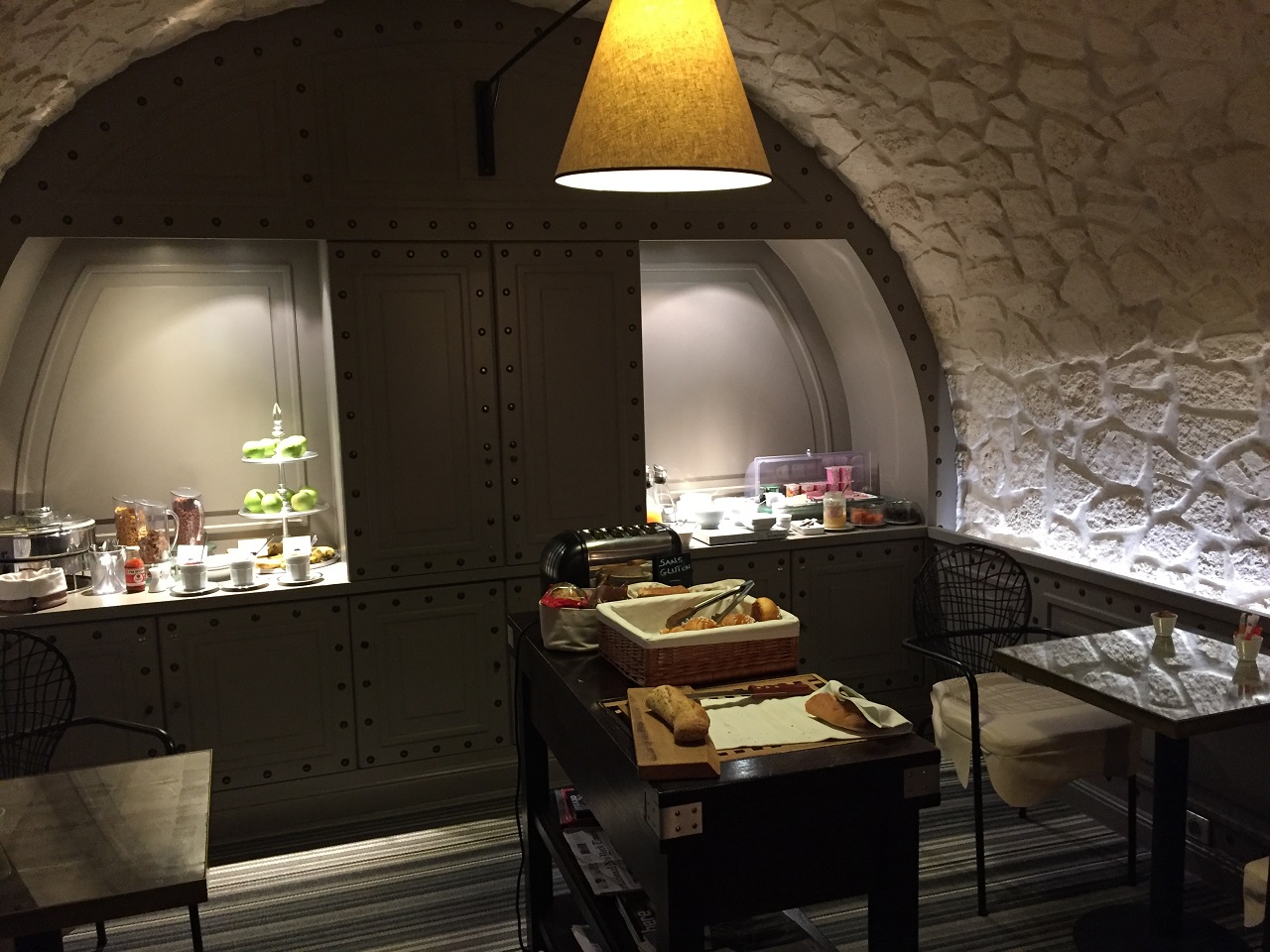 The basement breakfast room is adorable, original vaulted ceilings and brickwork and while we were usually the only ones there because Mom liked to sleep in, one day there were three full tables (the only time we saw other guests) the server asked for the room number and whether you wanted coffee or tea. She got confused with Mom & me as we had two room numbers and did different breakfast each day (extra charges on my bill but the front desk sorted those easily). Mom enjoyed her cereal and coffee each day while I overlooked the fact that it cost €15