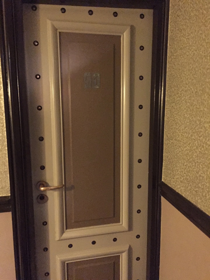 After exiting the elevator we had a few stairs to go up and the lights automatically went on (European hotel hallways are often dark unless used and go on with motion control). Our hallway had just five rooms – the two rooms across from us was being used by one family. The key is electronic so you only need to tap the end to the metal on the door. I showed Mom and she got it on the first try so it’s easy to use.
