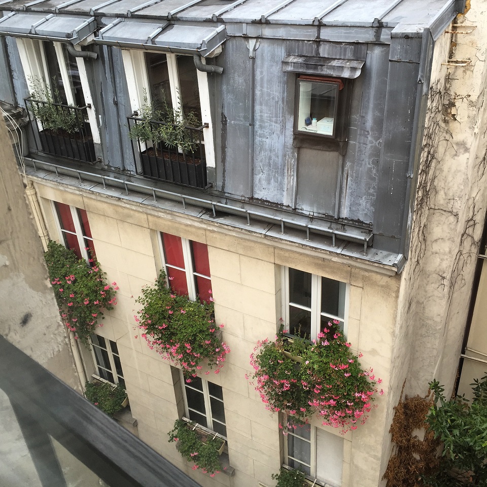 I noticed the sloping ceiling by the windows and took note to duck a bit when I opened the double windows which were shorter than me. I could see Mom’s window and had a similar view of the interior courtyard of buildings.
