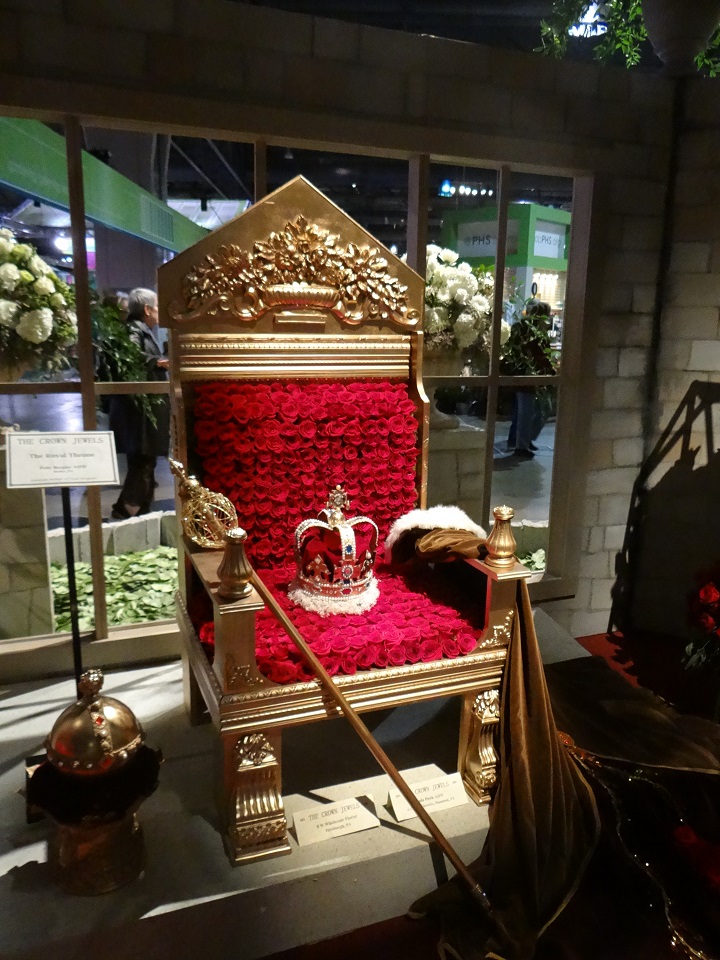 With the British theme of “Brilliant”, the Philadelphia Flower Show, I was keenly interested in attending after years of indifference. Working for a British company and visiting London for many years, I was intrigued to see how they would interpret this theme. As you enter the convention center show floor you are greeted by wonderful volunteers in front of the imaginative gates with royal crown and filled with flowers. You can choose to proceed straight down the red carpet lined by trees toward the Big Ben video screens or do as I did and make the classic right turn to start at the first display.