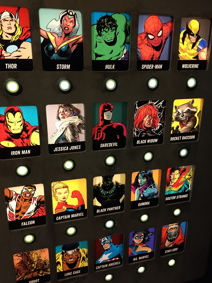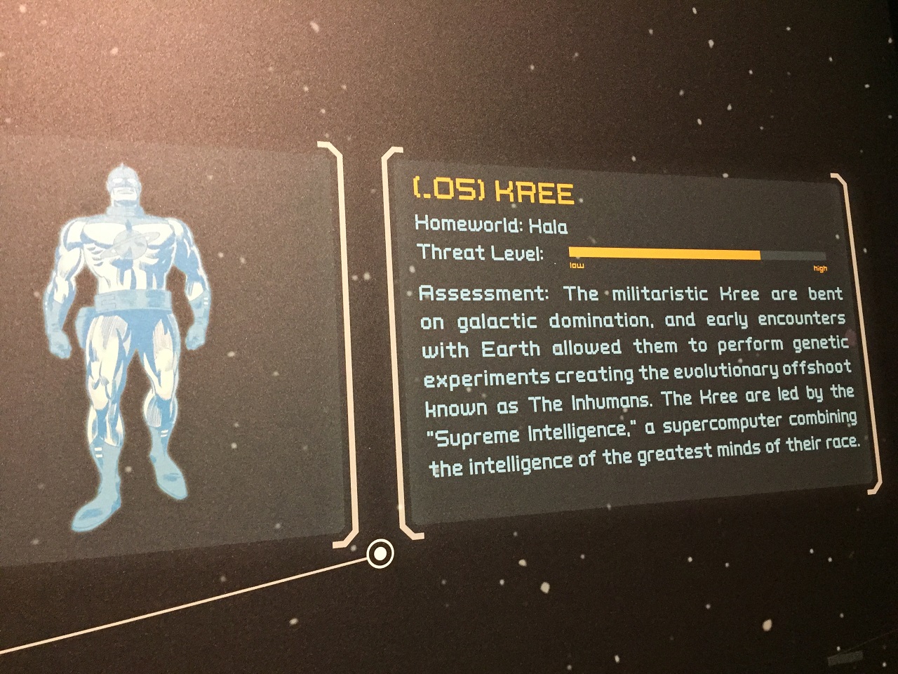 The world of superheroes needs not only villains but a world of aliens to encounter and potentially fight off world destruction. The map of alien worlds along with threat level and background information is truly for the superfan. You need to know which aliens are which. For me, after recently seeing Captain Marvel, I focused on the Kree because frankly that’s all I could remember. For the guy behind me with his Gen-X friends, they got a bit more intense into the deep dive of the aliens and didn’t need to read the boards.