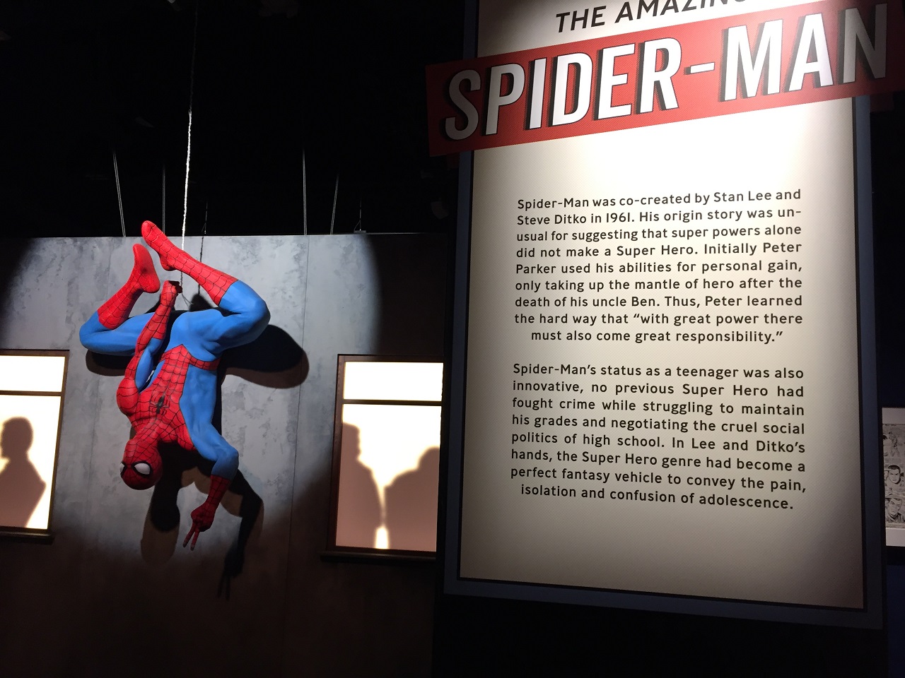 We all know the story of Peter Parker and have probably watched some (if not all) of the movies with different actors portraying the web slinger. The displays at Marvel Universe of Super Heroes highlights Spiderman over the years in the comics, art, props and newest entrant, Spiderman, Entering the Spiderverse, which received an Academy Award for animated feature. The Spiderverse introduces us to Miles Morales and the many universes of Spiderman. Spiderman continues to be a fan favorite and new movies are planned for the future.