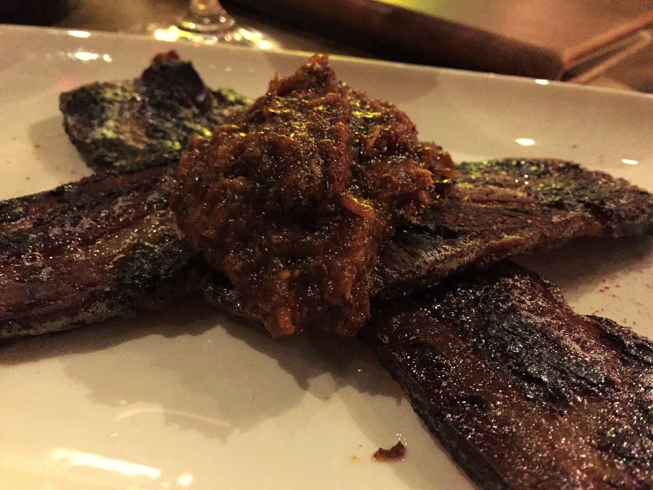 Surely, that’s it, gluttony over? One would think…..but we were having too much fun catching up over wine (the wine list is nicely curated). I started with a Willamette Pinot Noir and moved to a Malbec for the steak and bacon pairing. Since I was in full cheat mode, I was going all in…..as “an explorer of food”.
