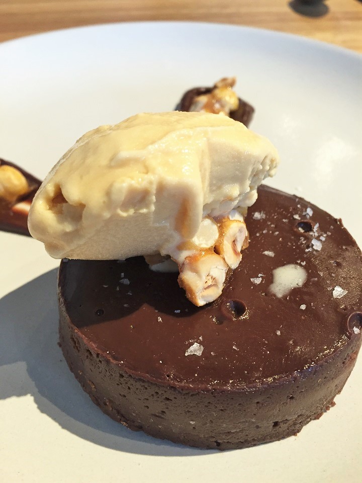I was going to pass on dessert (the gluttony and diet deviation was already bad) but she didn’t want to dessert alone and who am I to pass up chocolate? I had two interesting choices – the chocolate bon bons (six truffle like chocolates in flavors like lemon, raspberry, mint, hazelnut and two other flavors) or the chocolate sea salted whiskey ganache cake with hazelnuts (go ahead read that again to let it sink in).