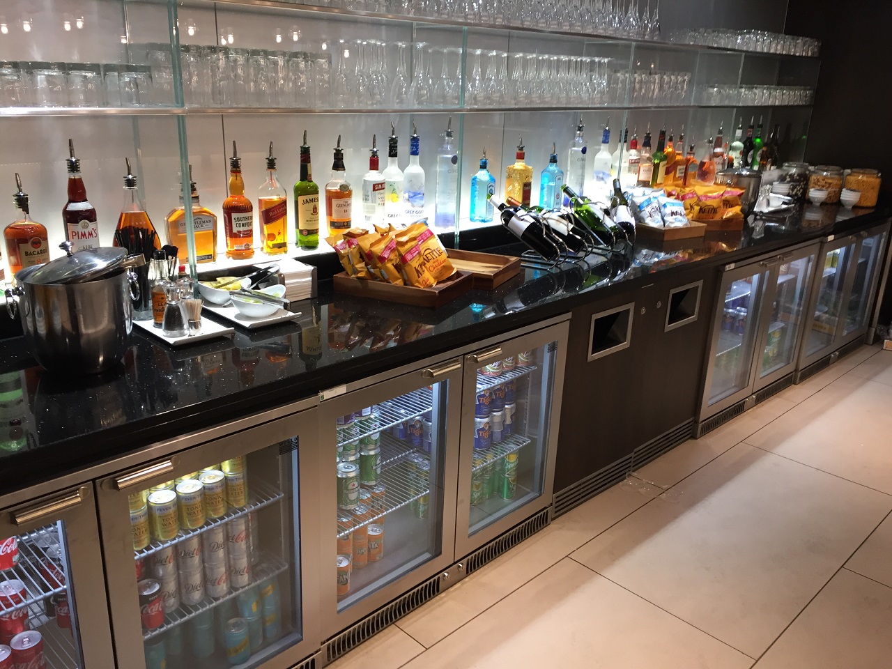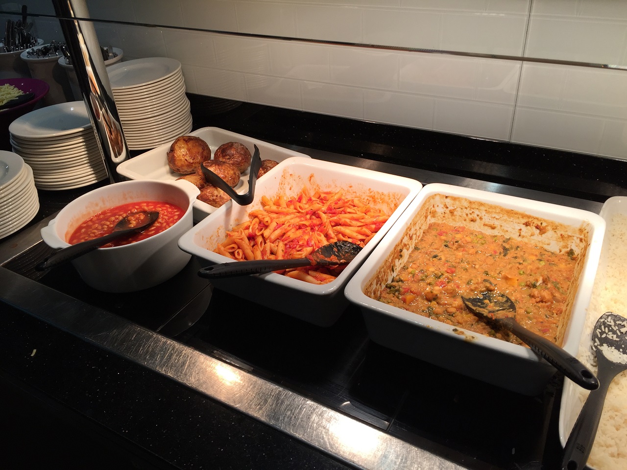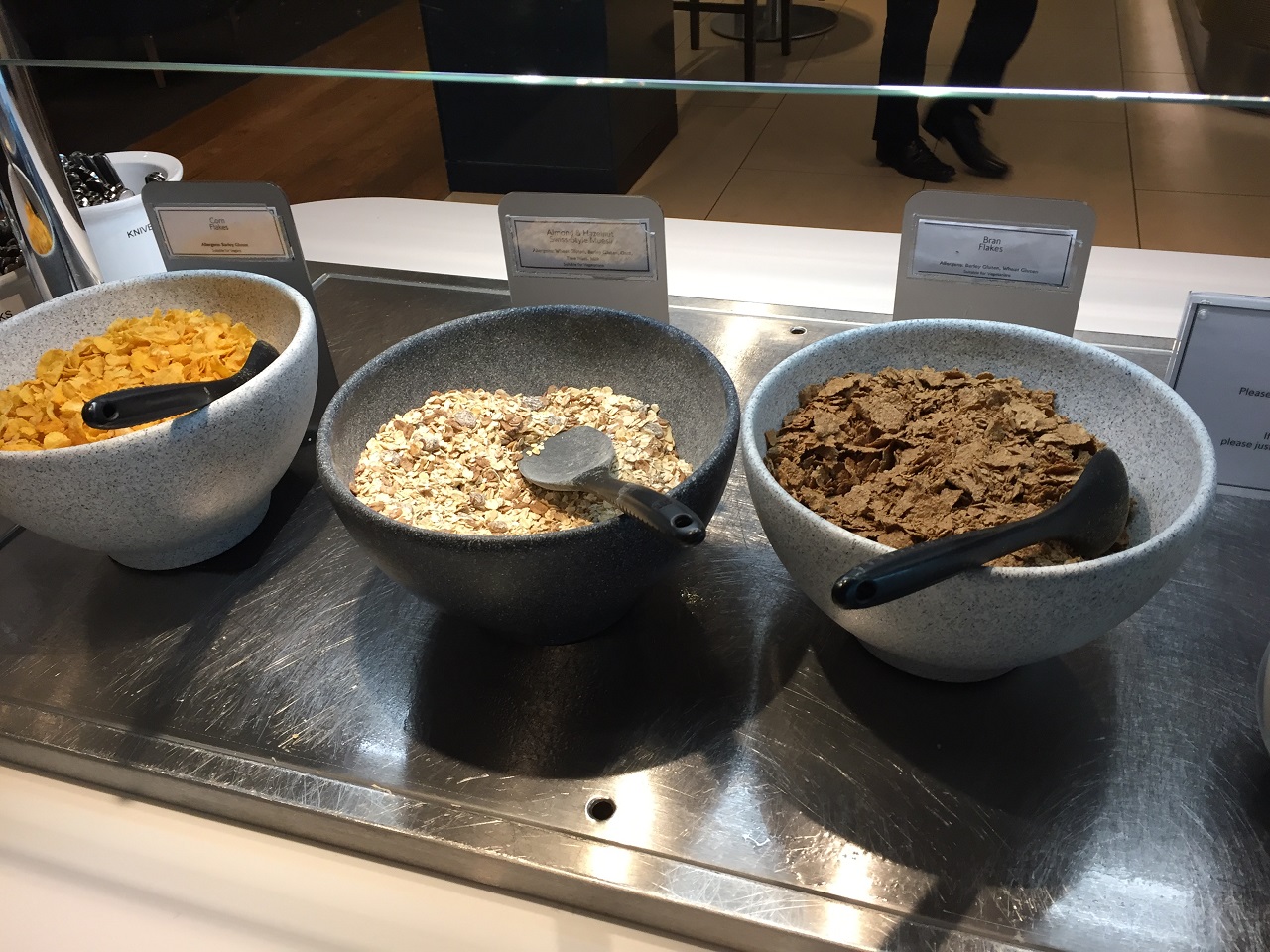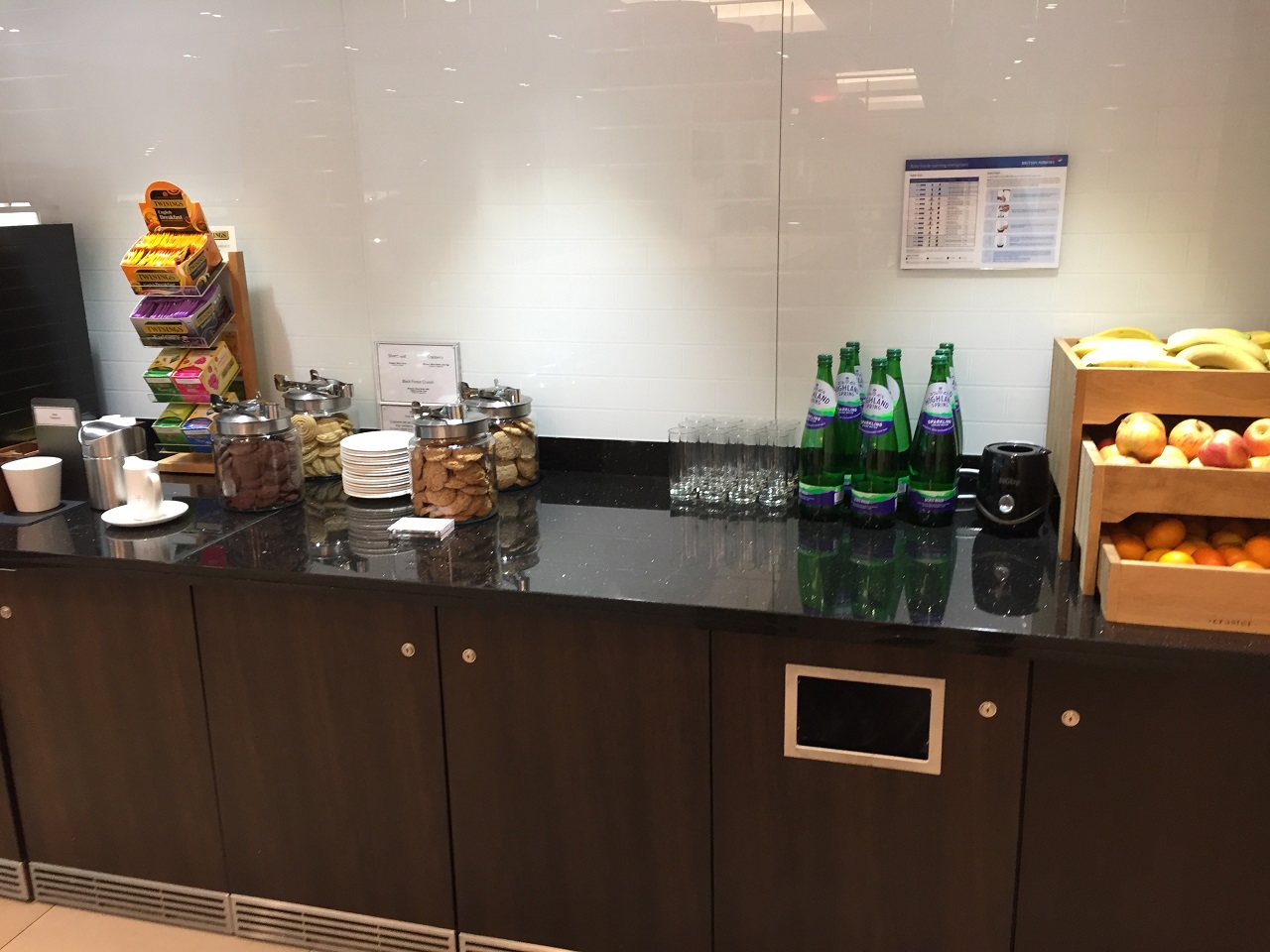 For an airport lounge, I think British Airways does a nice job with food options considering they are free. Plus they have a good selection of alcohol, cookies (bring a Ziploc if you want more than a few for the flight or wrap in a napkin – yes I know I have a problem!) and snacks (crisps, pretzels, etc.). I’ve never gone hungry at a British Airways lounge. Since I was grounded in the lounge for three meal services, I was able to see what was on offer that day for breakfast, lunch and afternoon tea time. The drinks area with liquor and other area for coffee/tea are available all day.