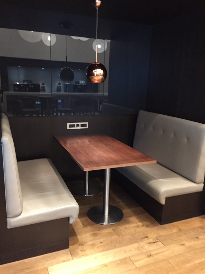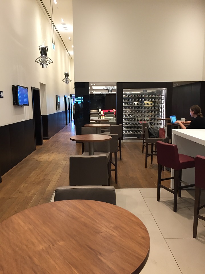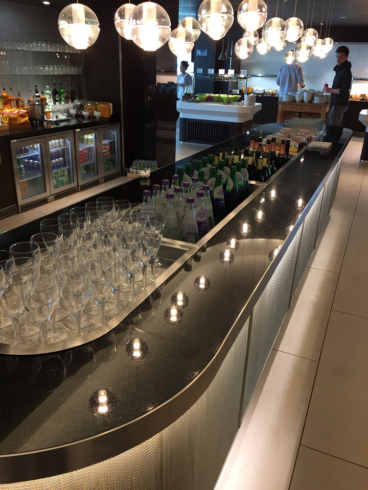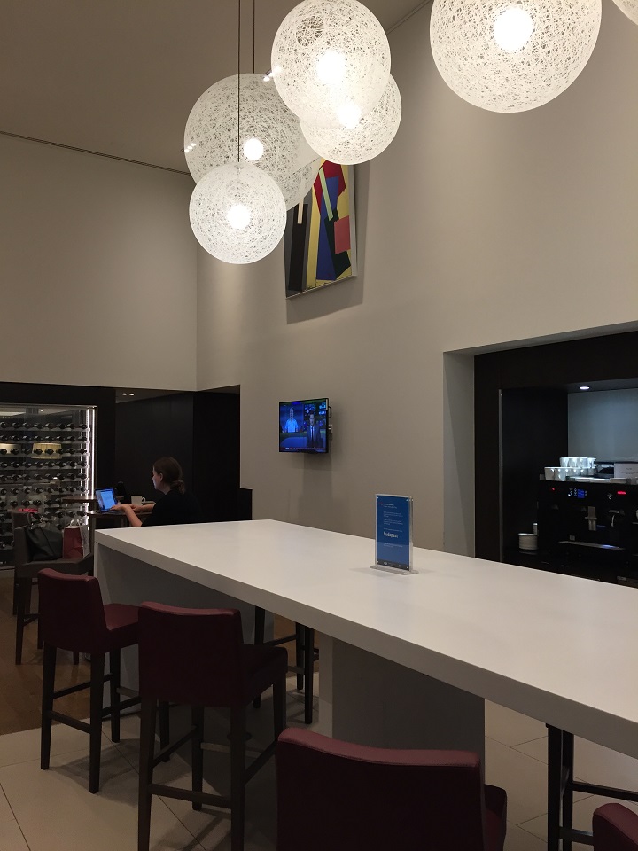 Since this lounge was updated in the past few years, you can see the differences vs other lounges you may have experienced at Terminal 5 Heathrow (Galleries Lounge T5 or Concorde Room LHR) or in my hometown of Philly (BA Lounge Philly). While there are many seating areas, this lounge included booths to work in or chat with a group, high top communal tables as well as couches, individual sunken chairs and a second level of options accessed via an elevator or stairs (one spiral, the other straight). Televisions were on throughout the lounge.