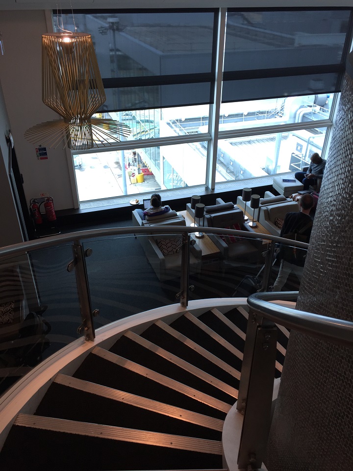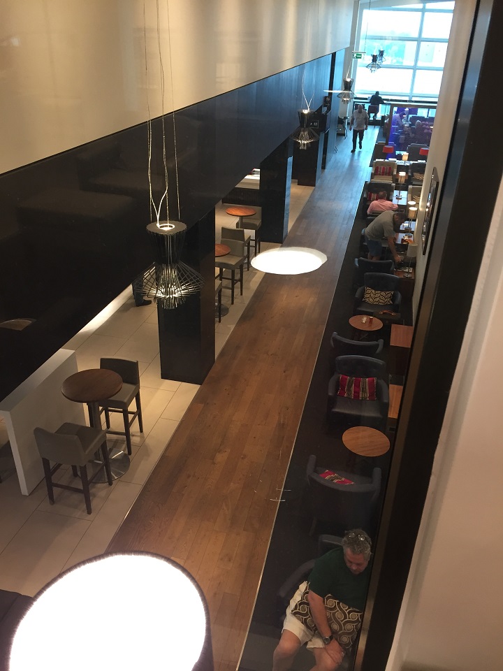 One nice feature of the BA Gatwick Lounge is the second level mezzanine seating area which overlooks the lounge and runway views below. I sought this quiet area out when I first arrived but surprisingly it was crowded and loud with business travelers and groups. When I returned after breakfast, it was empty and quiet (for a short while anyway). I found a seat and plugged in to recharge my phone and was quickly on the lounge internet to kill some time. There are several configurations – separate lounge chairs, sofas and a high top communal table – to relax and/or work with while in the lounge. The lift can take you to the mezzanine level or you can use one of the two stairs (circular or straight).