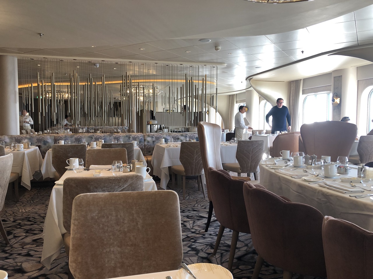 I was booked to eat in both the ‘Cosmopolitan’ (main dining room) and “Luminae” (suite class dining room). In Cosmopolitan I ate alone and was perfectly comfortable with a discrete table. In Luminae we had a small group sat privately to enjoy the experience. Cuisine was everything you would expect and service so much more engaging and empathetic than I’ve seen before. What marked the experience in both restaurants was the quality of service and presentation.