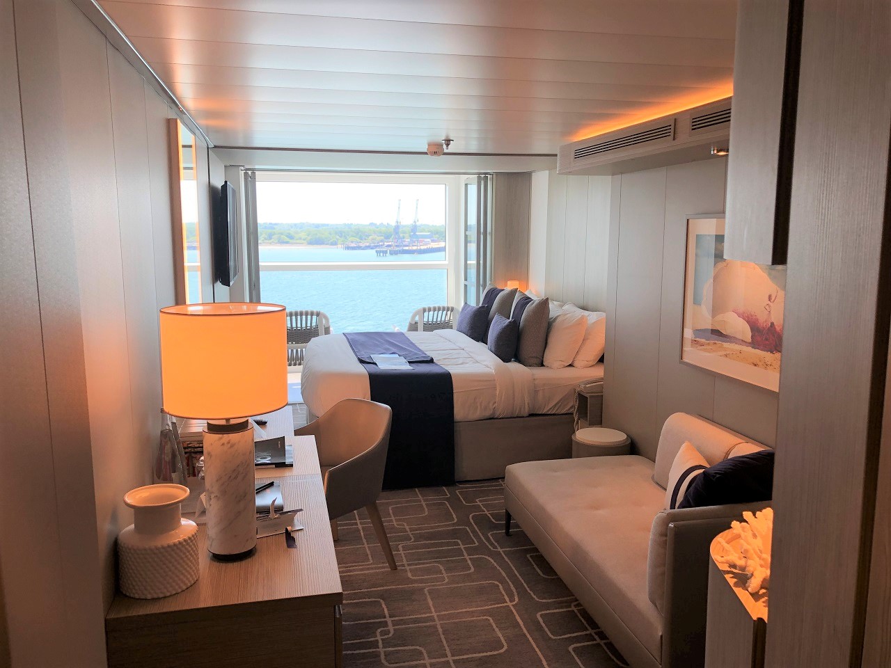 The “WOW” moment is when you see the balcony (Infinite Verandah), its part of the room! So much light and space, the Ocean feels part of the room! The killer feature is a drop-light window which, at the touch of a button, descends to mid-level to open up the whole room to the sun and sea. If a “traditional” balcony is needed simply extend the folding glass doors if not – enjoy the light, sea and air through your stateroom.