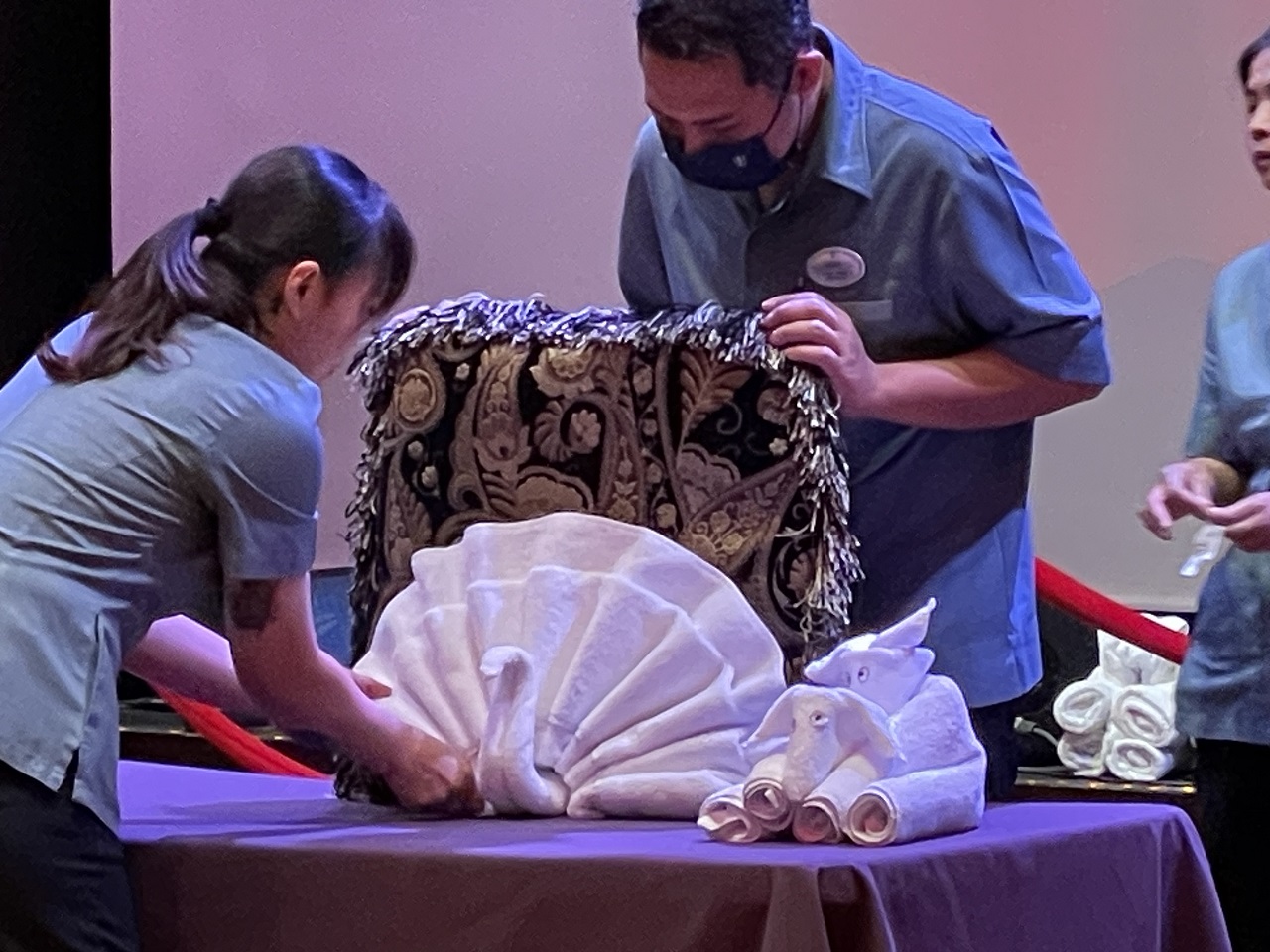 The cabin set up had my bed near the balcony with the couch near the bathroom – I like this setup best on cruises. A recent change to housekeeping has eliminated twice a day visits and now the room is serviced once a day which was fine as we did not have port heavy itinerary with multiple showers required from beach or activities. The famous towel animals are also gone (saving the environment with less towels to use/wash each day) and while once showed up on the first day, if I wanted to see more and learn how to make them on my own, a towel animal demonstration was held as an activity in the Music Hall. This was the first cruise where I rarely saw or interacted with my cabin attendant and I think much of that is due to the housekeeping change. If I needed anything I was told to call housekeeping.