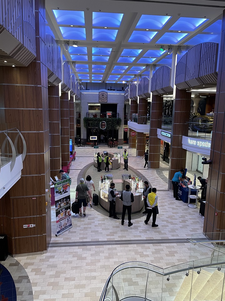 From the Westin Moana Surfrider hotel, I ordered an Uber to the cruise terminal. Since I had bought “The Key”, I was to have a special check in area but that was closed for renovation so I was directed to general check in area. Given that “The Key” has early arrival time of 11am-11:30 am the general hall was full of staff but lacking passengers so it was easy to navigate and be directed. I had checked in via the Royal Caribbean app so had my sail pass in my phone that needed to be scanned. I met a staff member who scanned my code and directed me to the escalators to the ship. Easy breezy. When I think of all the times crammed into terminals waiting to check in and then boarding, the online option makes check in so much easier and reduces the stress.