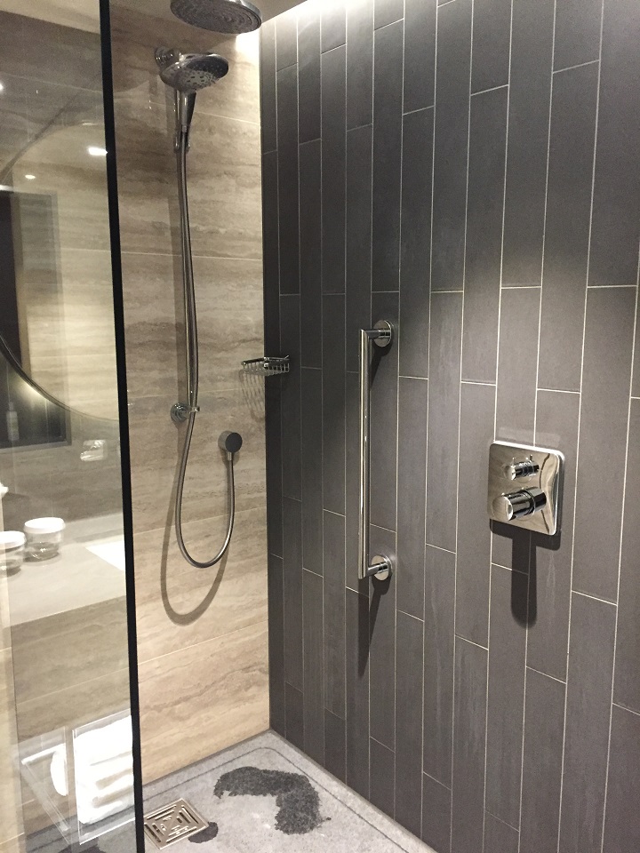 The desk had multiple outlet options as did both bedsides. There was a mirrored box on top of the table which held the hairdryer. No need to hunt for the hairdryer in drawers, cabinets or crawl under the bathroom vanity. Along with the various outlets which included USB ports (yeah, no need for bulky converters) there were many buttons for lighting options including a nightlight in the bathroom which illuminated under the vanity to avoid full light on in the middle of the night.
